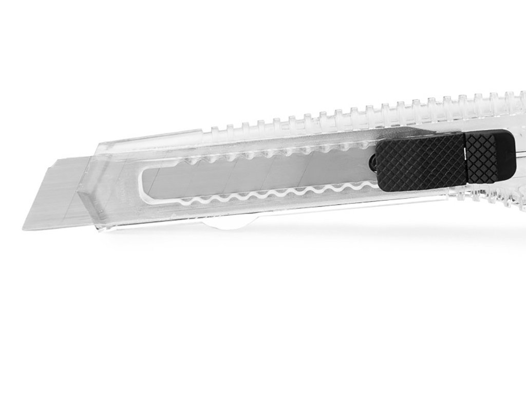 Nůž v transparentní barvě s odlamovací čepelí o výšce 18 mm.