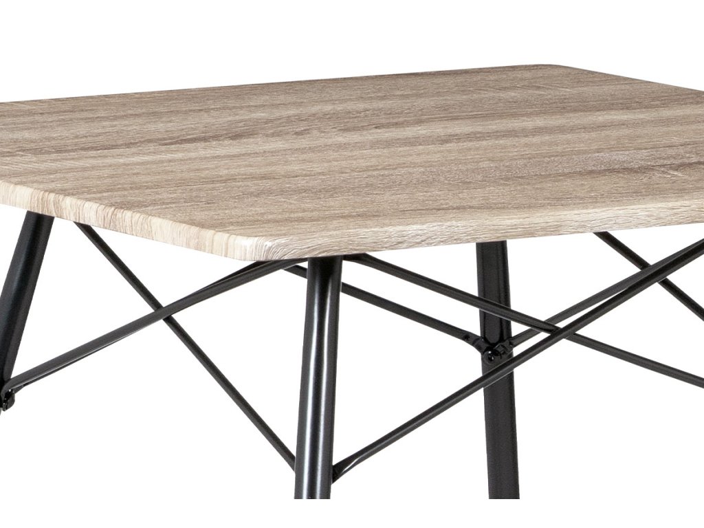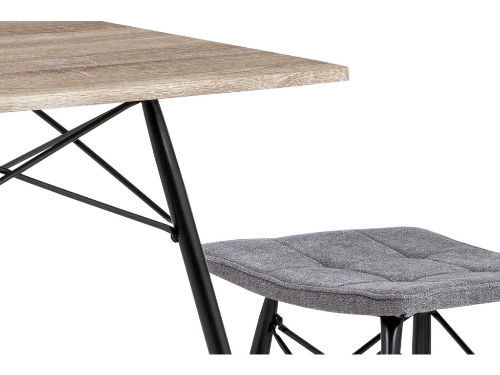 Deska stolu je z 1,5 cm vysoké MDF v dekoru dub Sonoma a je připevněna k moderní kovové podnoži, který je lakovaná černou matnou barvou a součástí podnože jsou černé plastové kluzáky, které snižují riziko poškození Vaší podlahy.