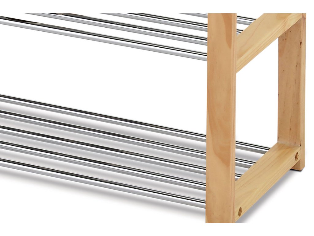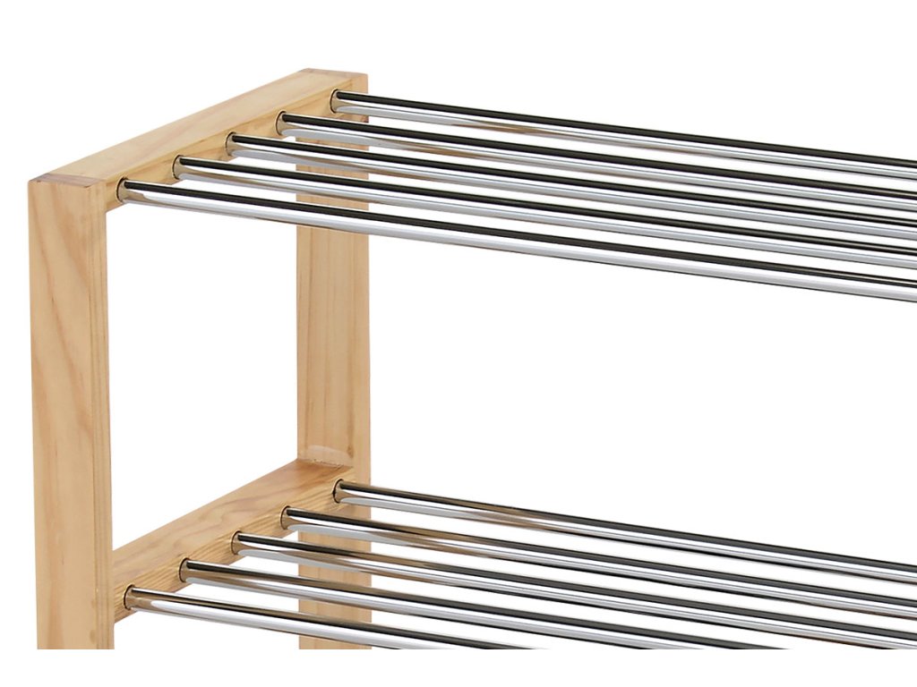 Praktický dřevěný botník s čtyřmi kovovými rošty.