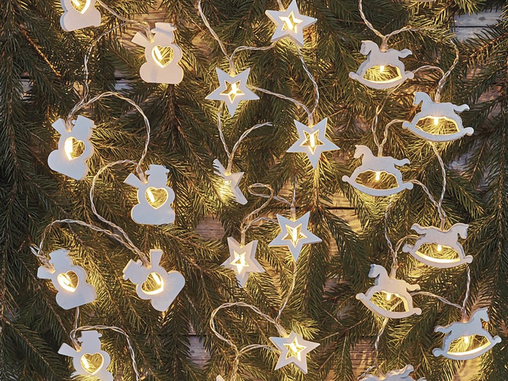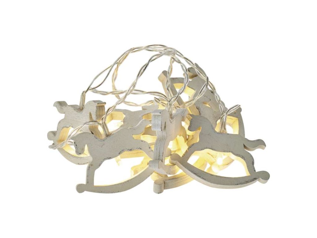 Řetěz je bílý s LED diodami, na které jsou připevnění dřevění koníci.