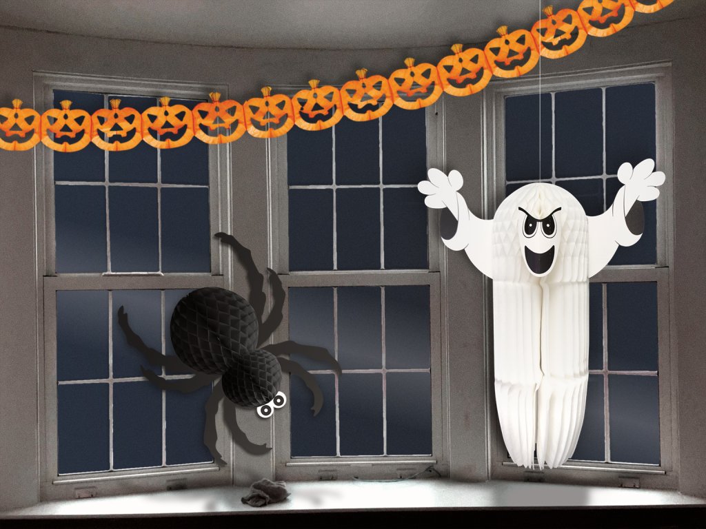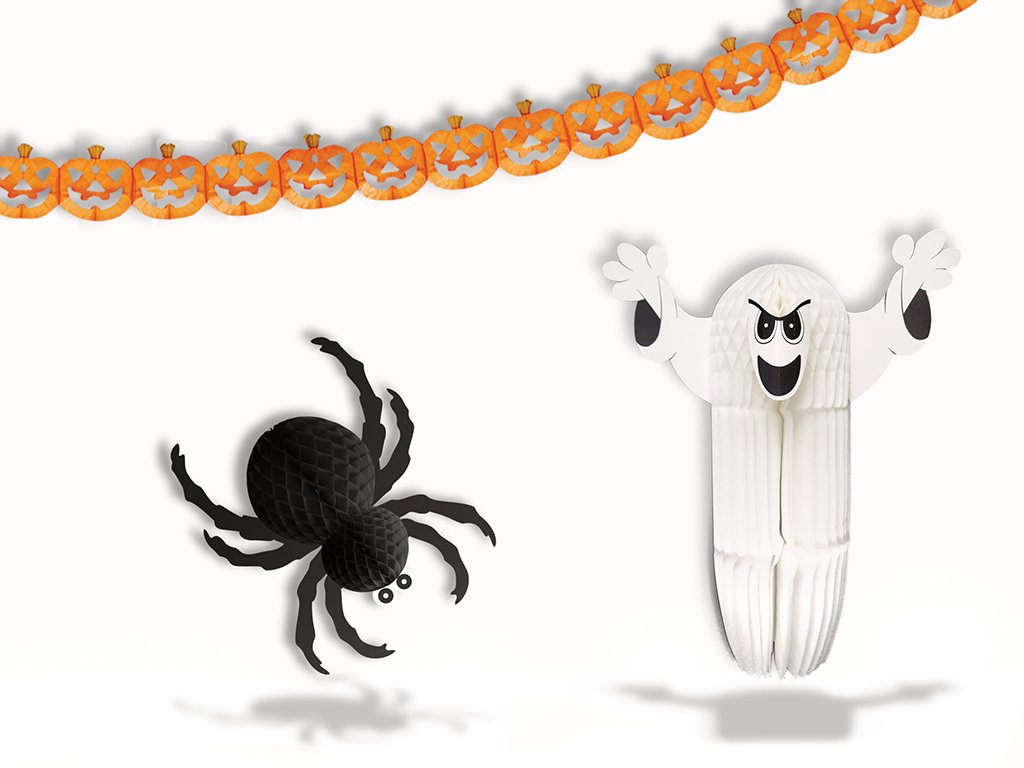 Sada 3 ks papírových dekorací: pavouk, duch, řetěz s dýněmi