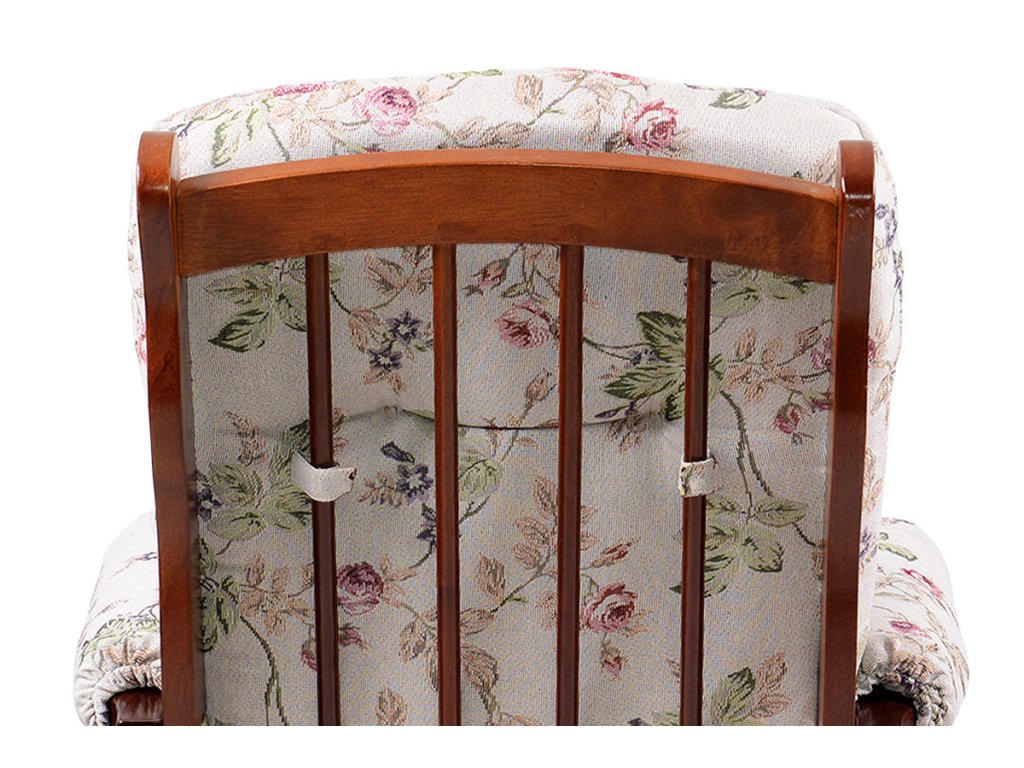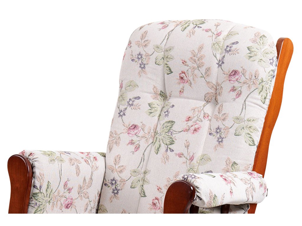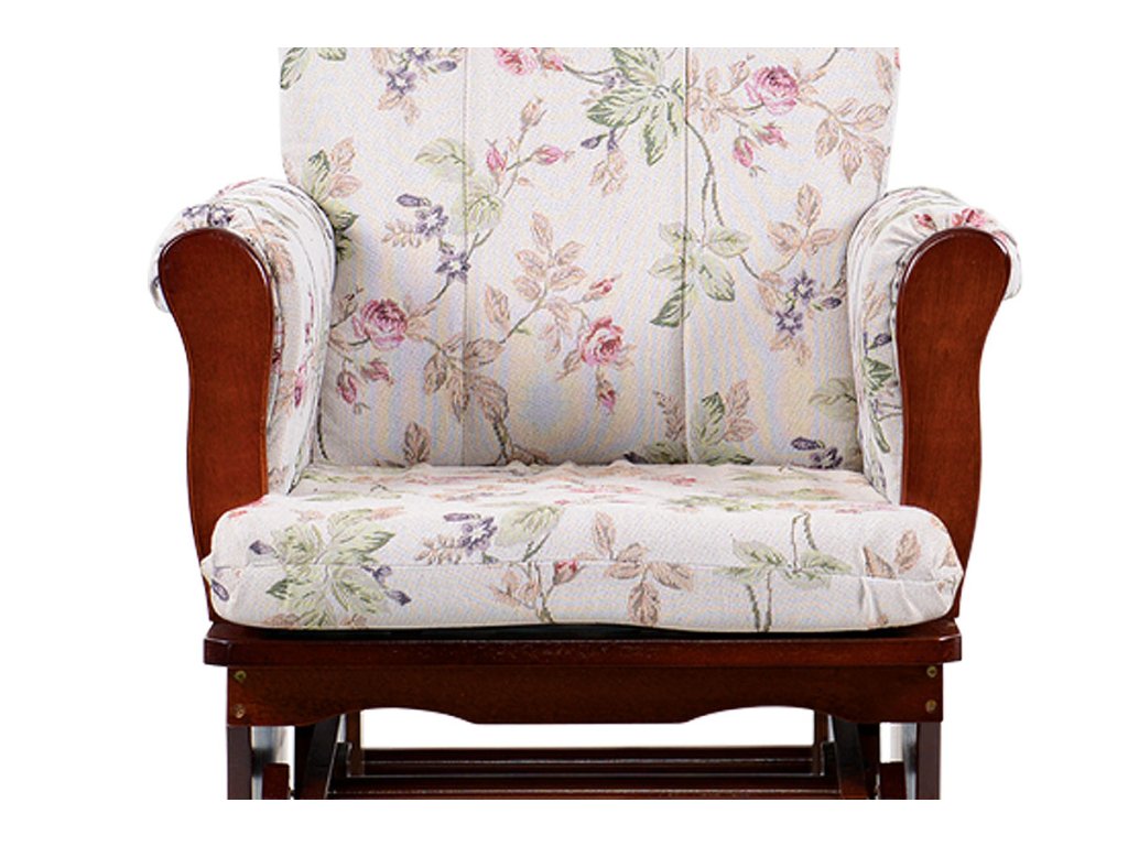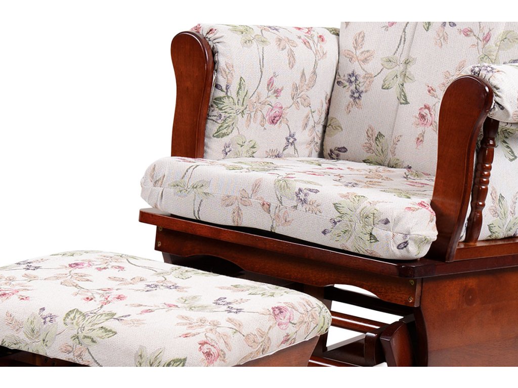 Potah je ze světlé látky s květinovým motivem, kostra z masivního bukového dřeva v povrchové úpravě ořech.