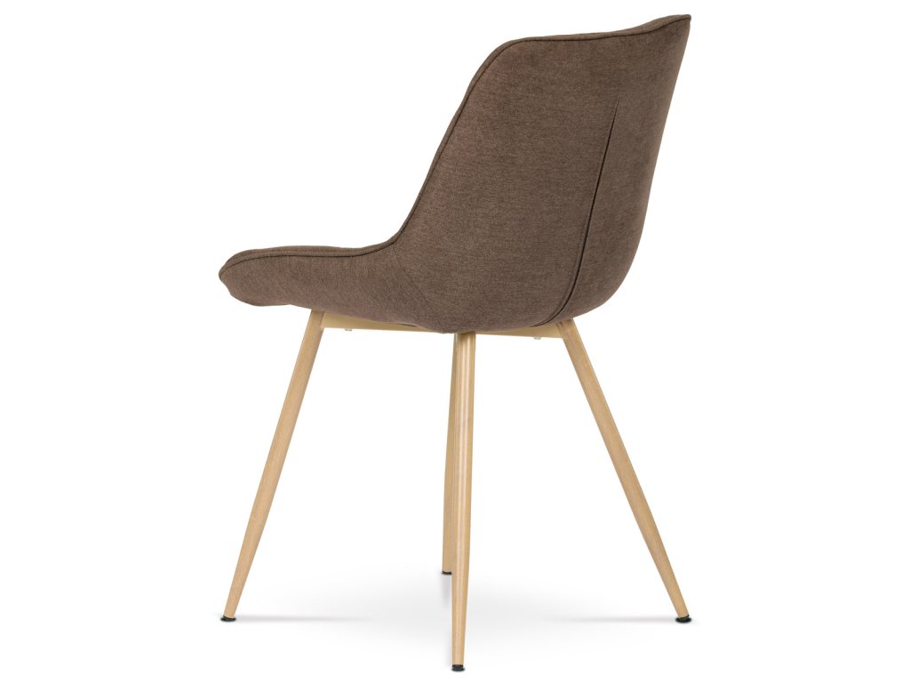 Designová skořepinová jídelní židle je čalouněna hnědou látkou s výrazným prošitím sedací části i části určené k opření.