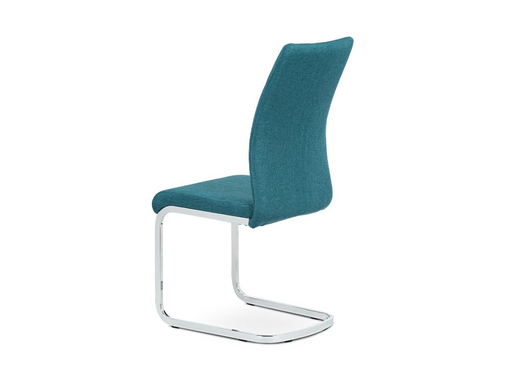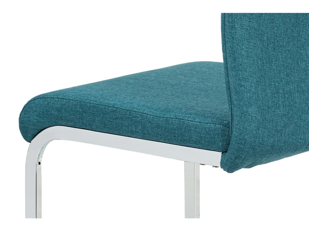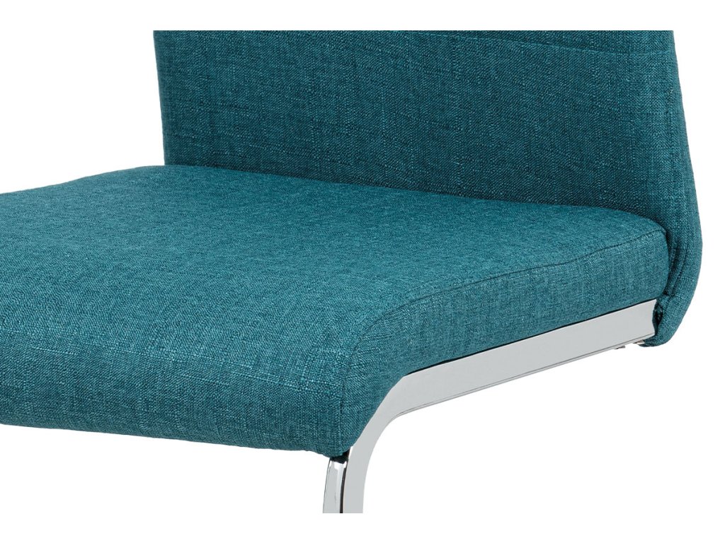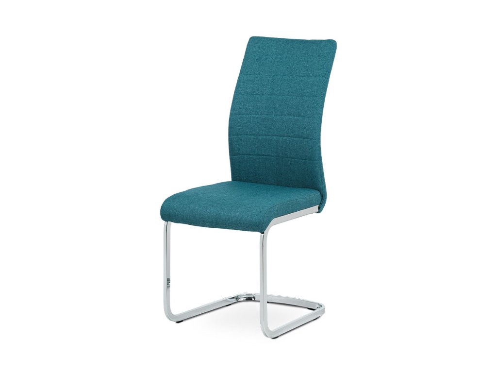 Moderní jídelní židle s jednoduchým designem je čalouněná příjemnou látkou modré barvy s elegantním prošitím opěráku.