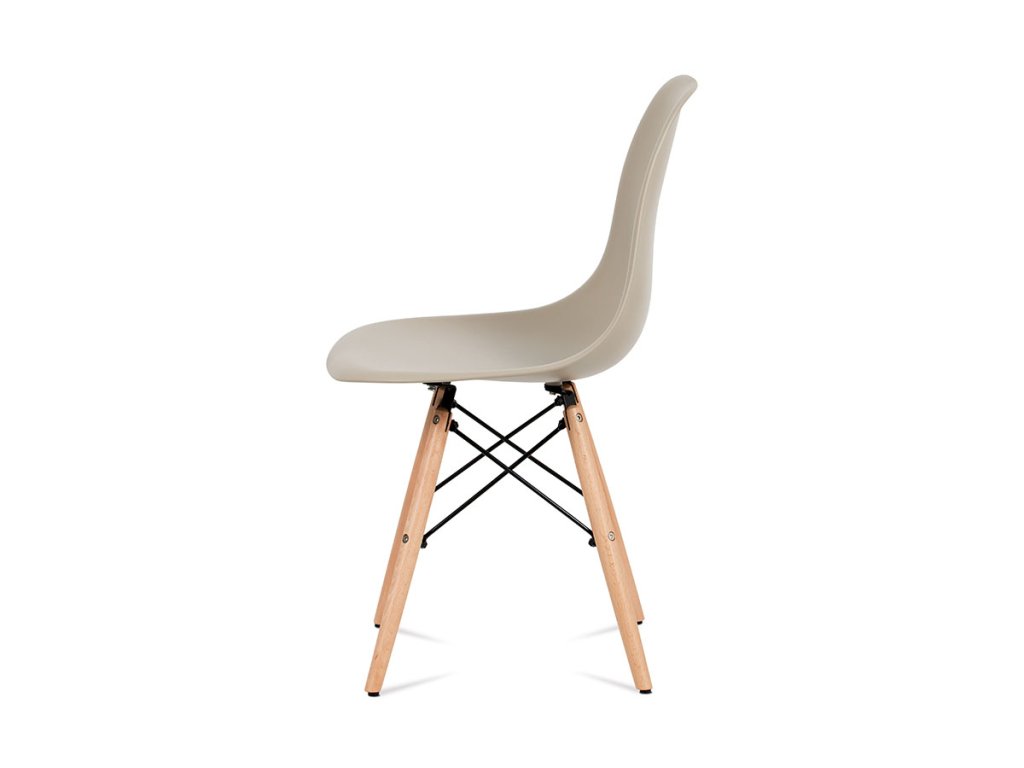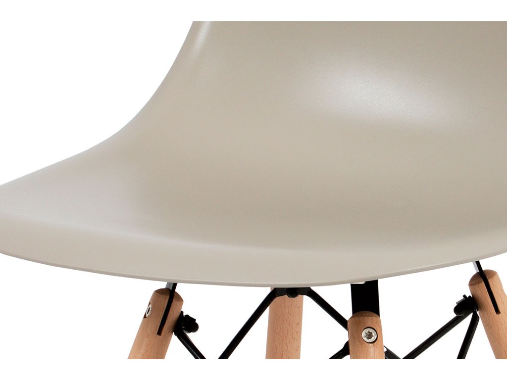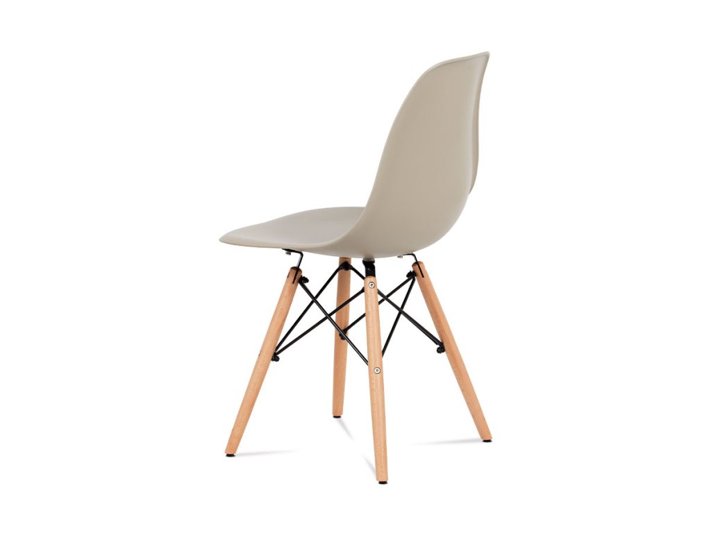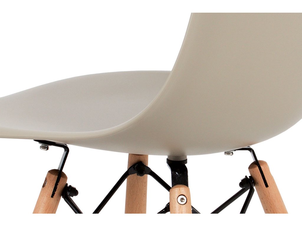 Tvarovaný plastový sedák a nohy z bukového masivu v přírodním odstínu s černými kovovými výztuhami.