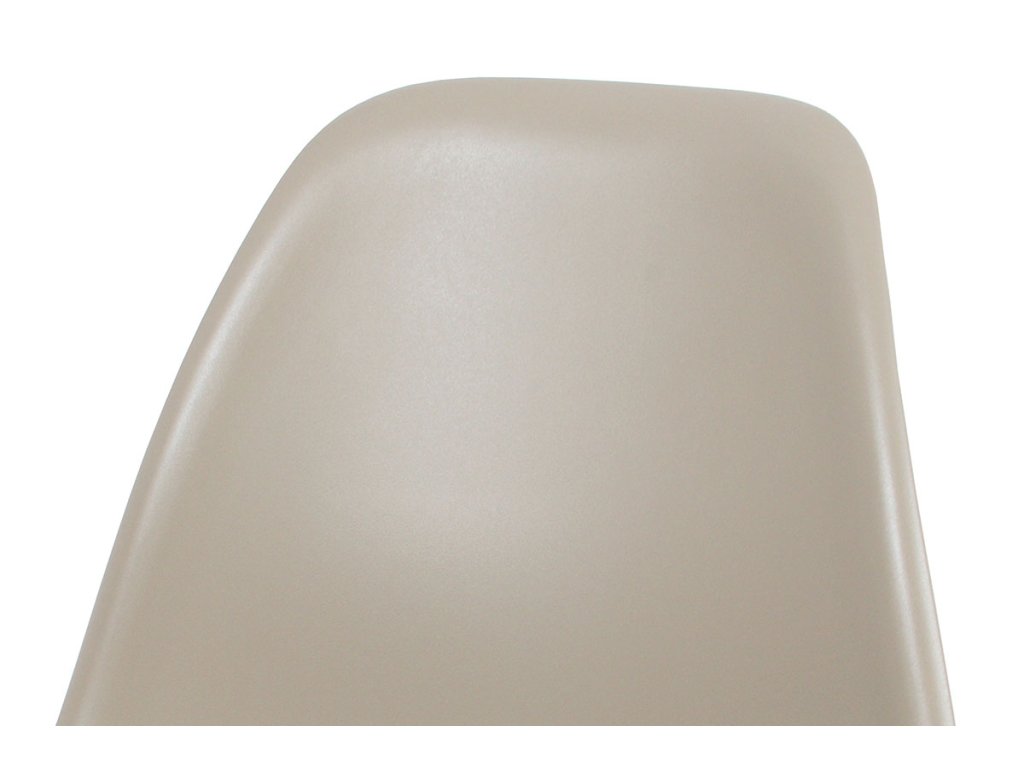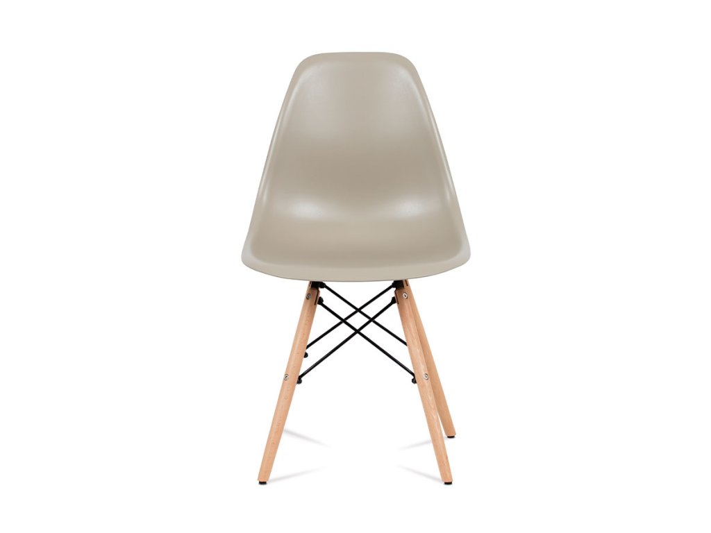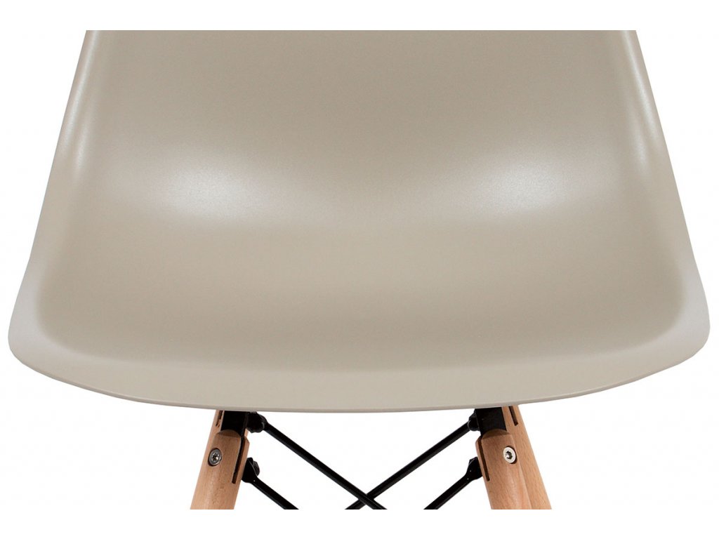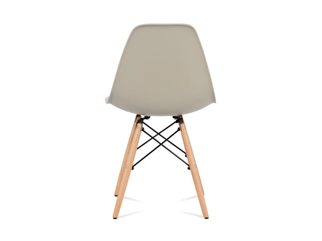 Tvarovaný plastový sedák a nohy z bukového masivu v přírodním odstínu s černými kovovými výztuhami.