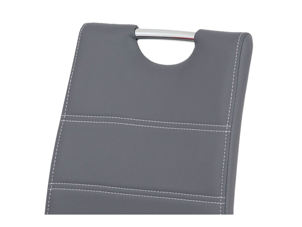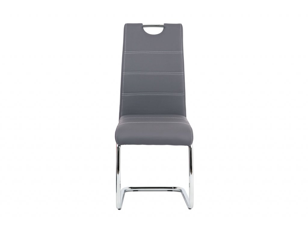 Moderní jídelní židle je čalouněná šedou ekokůží s dekorativním bílým prošitím sedáku i opěráku.
