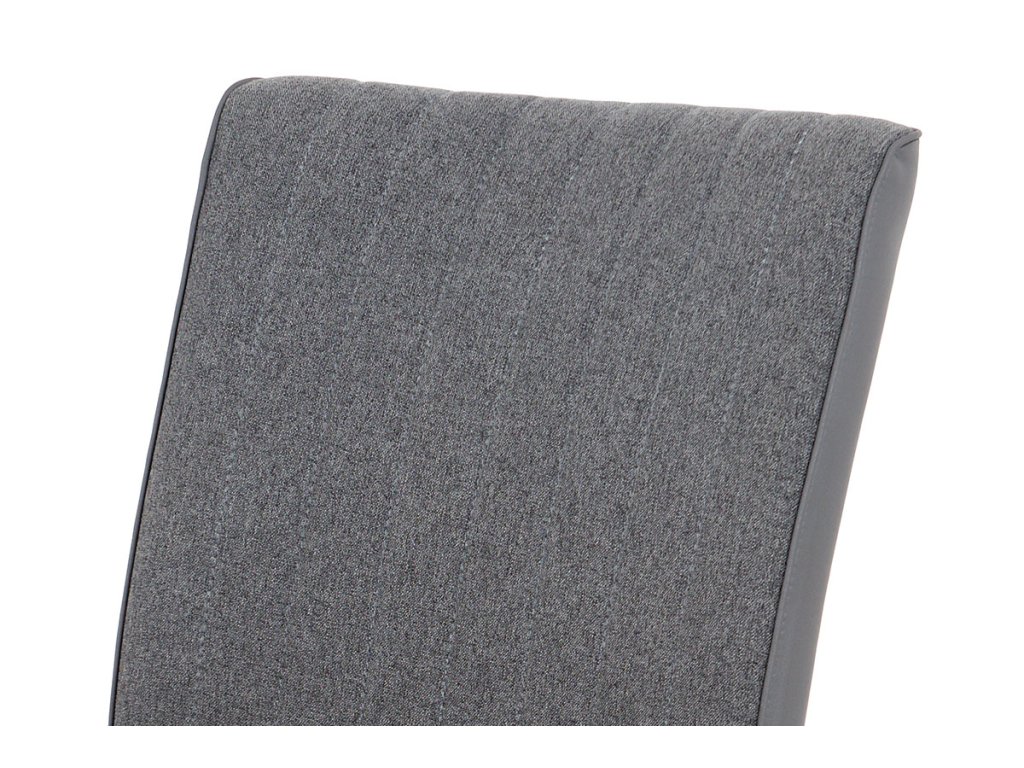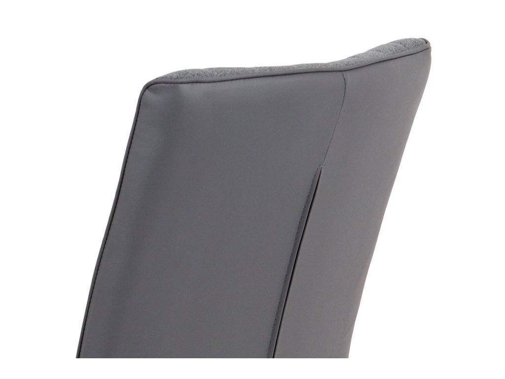 Opěrák i sedák jsou potaženy kombinací jemné látky koženky šedé barvy, kostra židle je vyrobena z kovu.