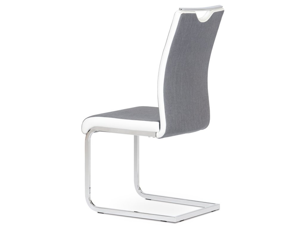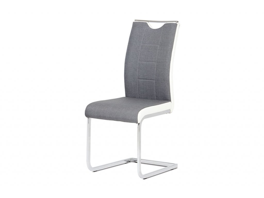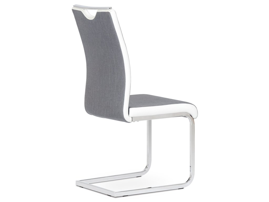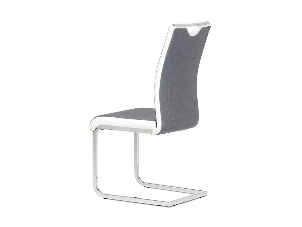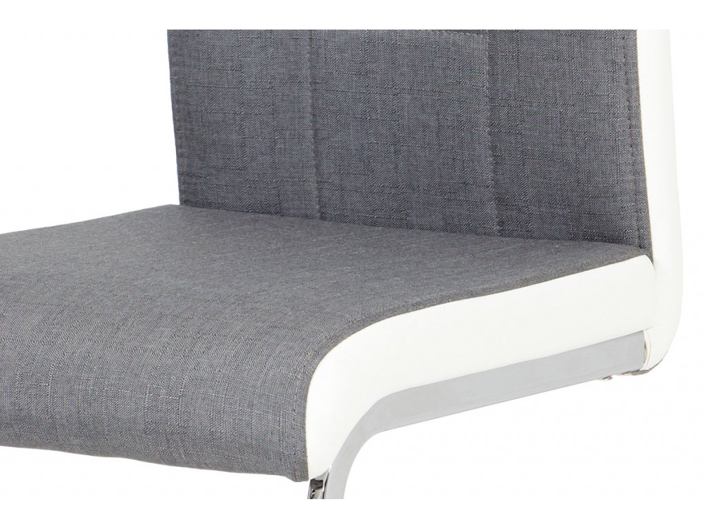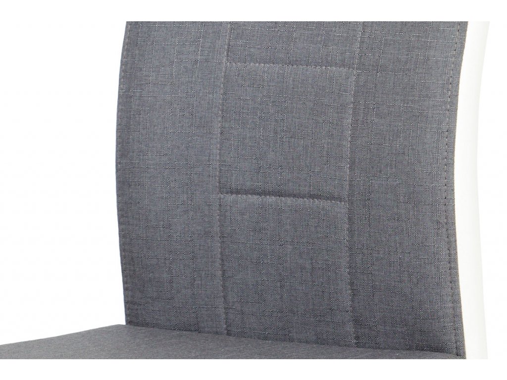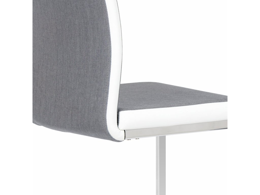 Moderní jídelní židle s dekorativně prošitým opěrákem je očalouněná šedou látkou v kombinaci s bílou koženkou.