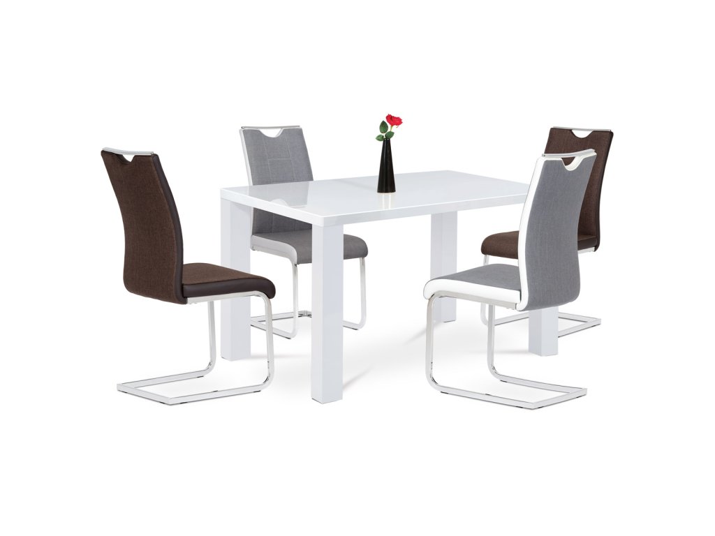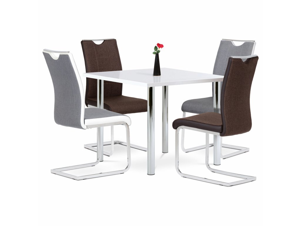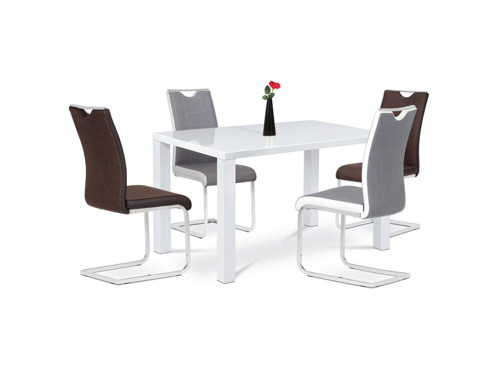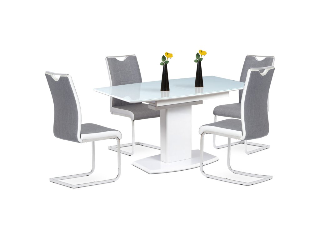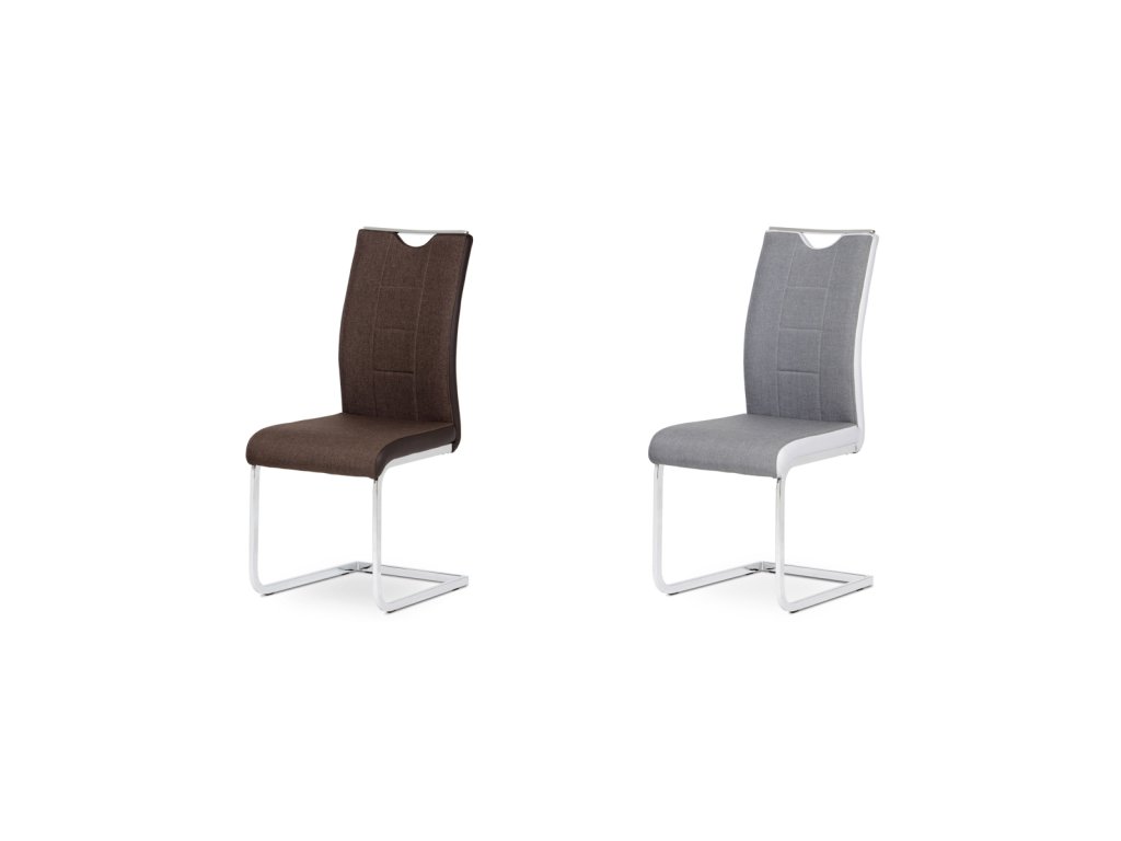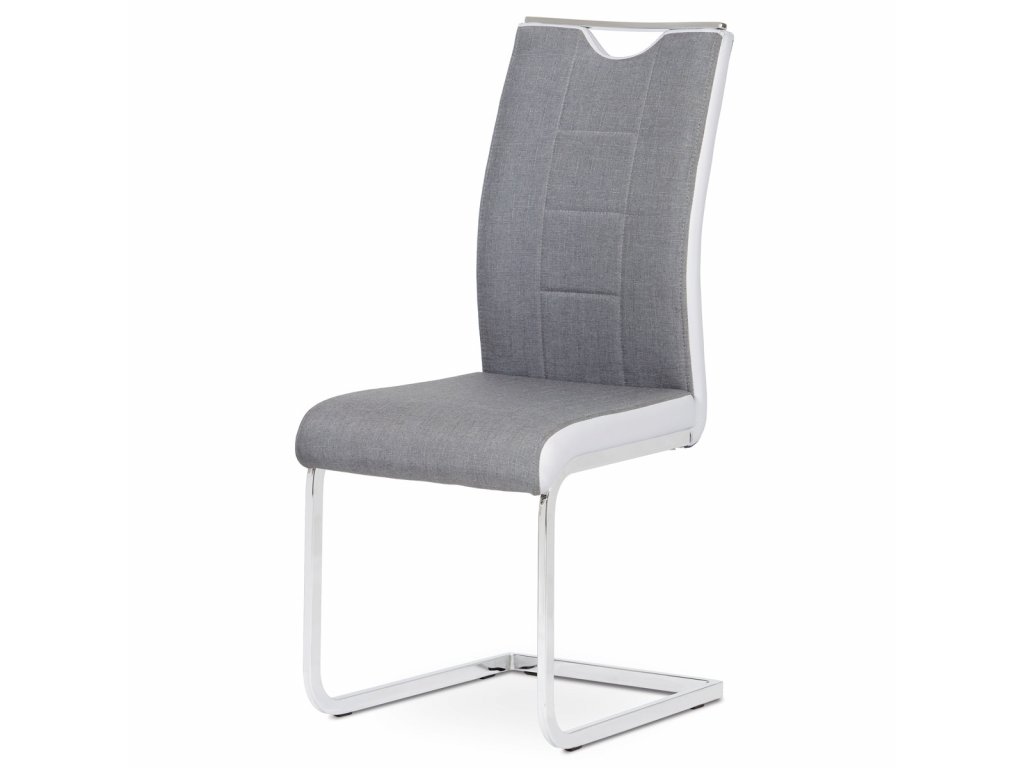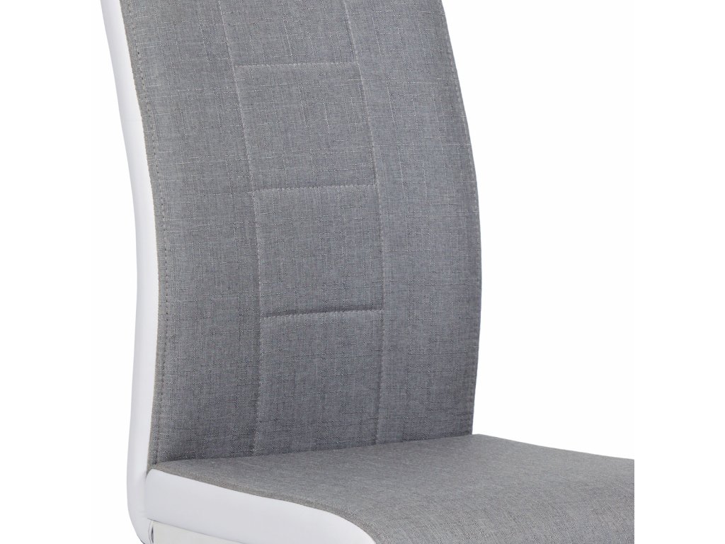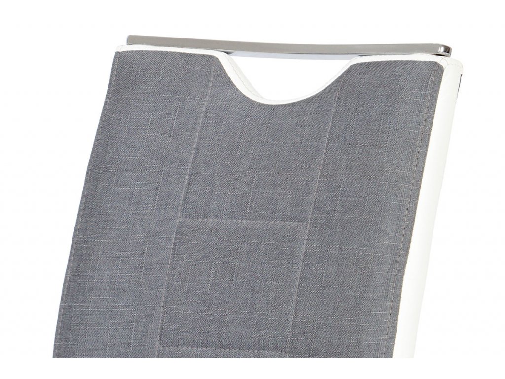 Moderní jídelní židle s dekorativně prošitým opěrákem je očalouněná šedou látkou v kombinaci s bílou koženkou.