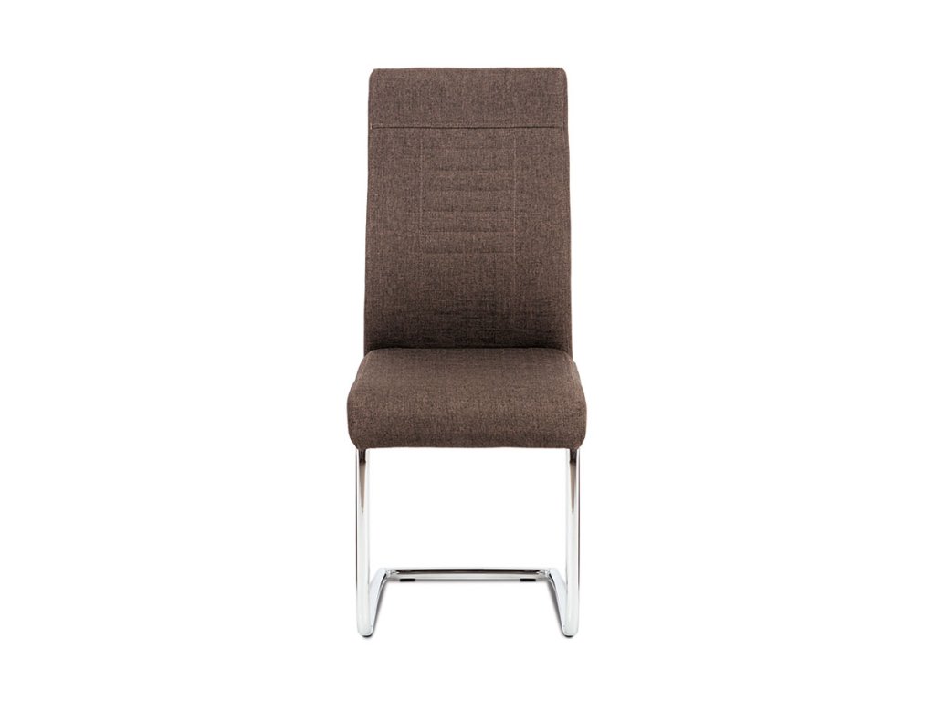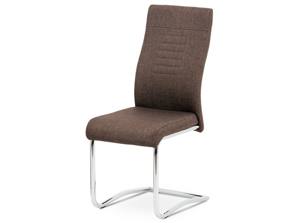 Moderní jídelní židle s hnědým látkovým sedákem, elegantním prošitím opěráku a pohupovou chromovou podnoží bude ozdobou každé kuchyně, či jídelny.