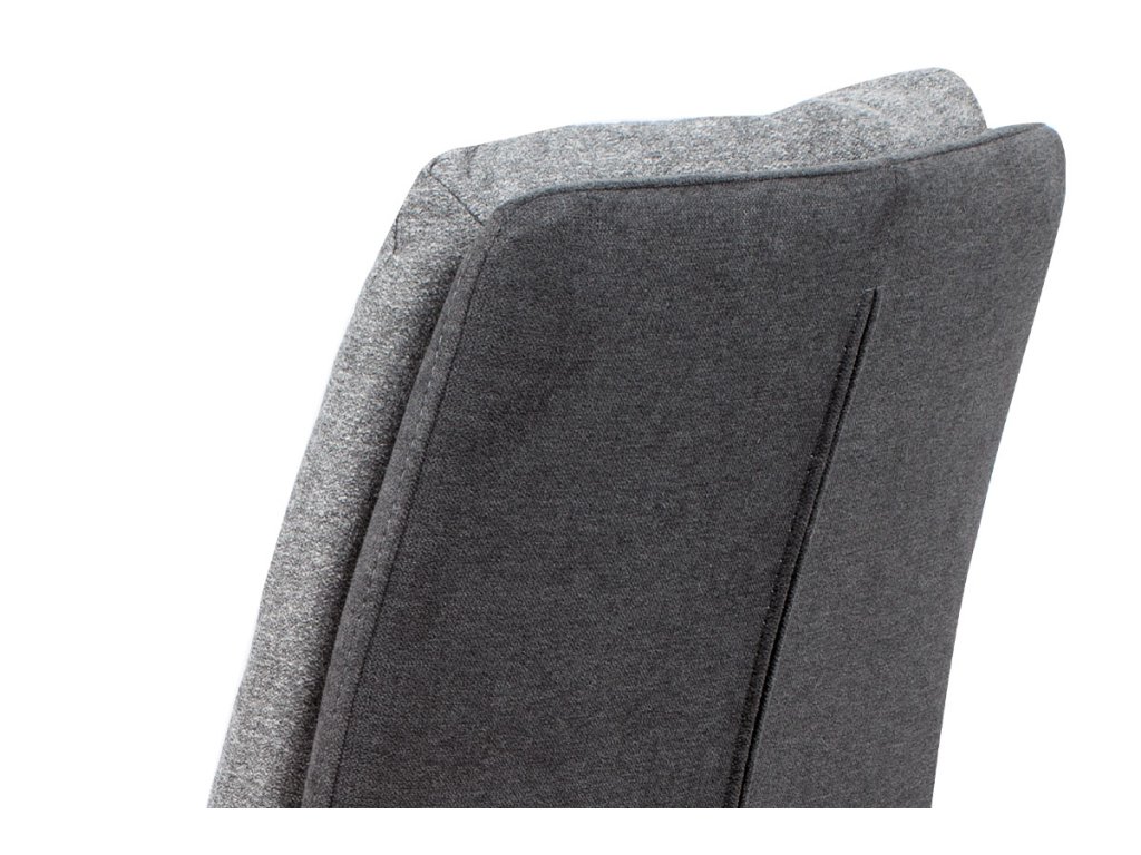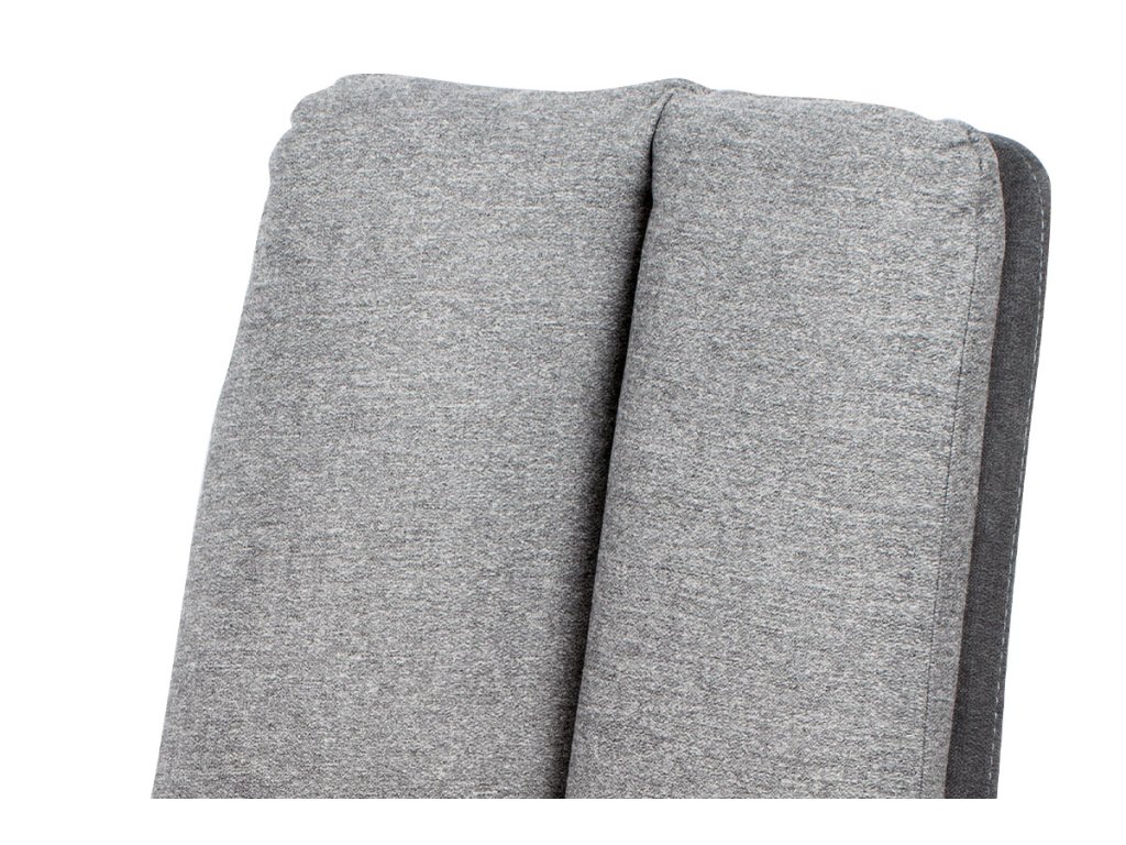 Potah kombinace světle šedé (čelní strana) a tmavě šedé (zadní strana) látky, s hlubokým vertikálním prošitím sedáku i opěráku.