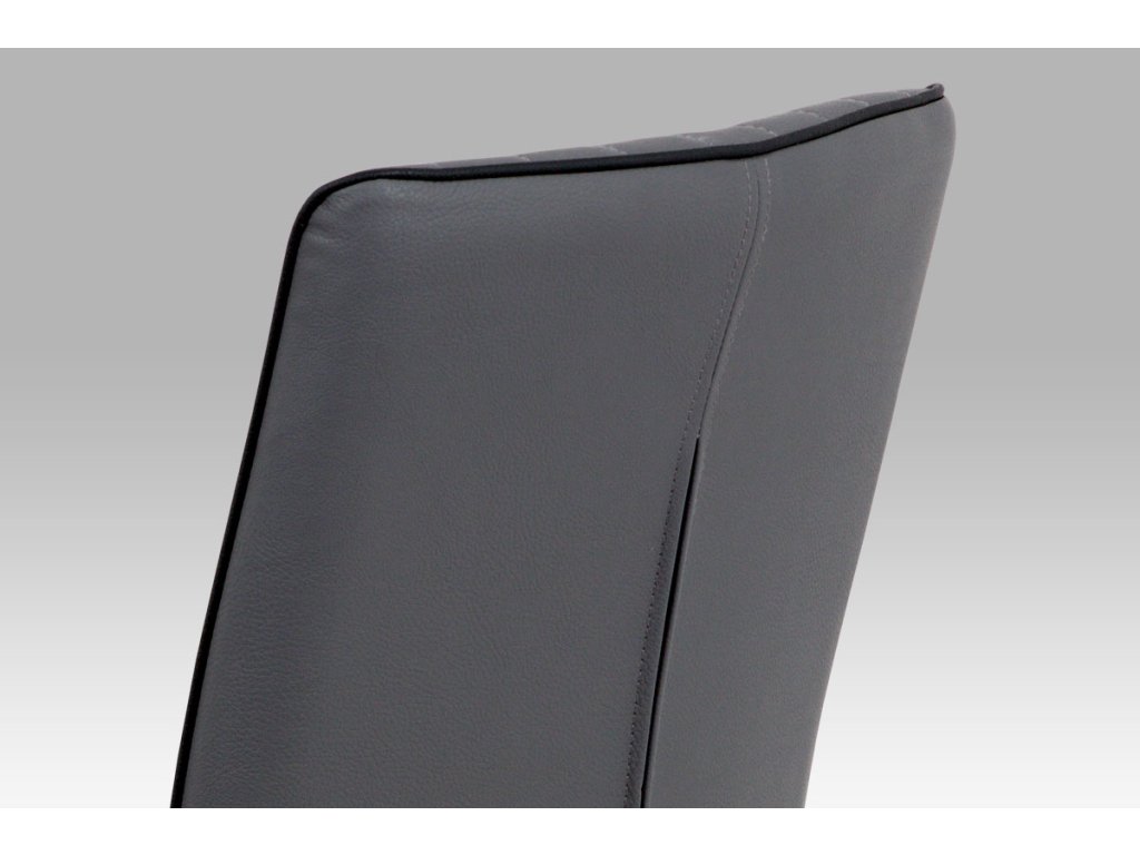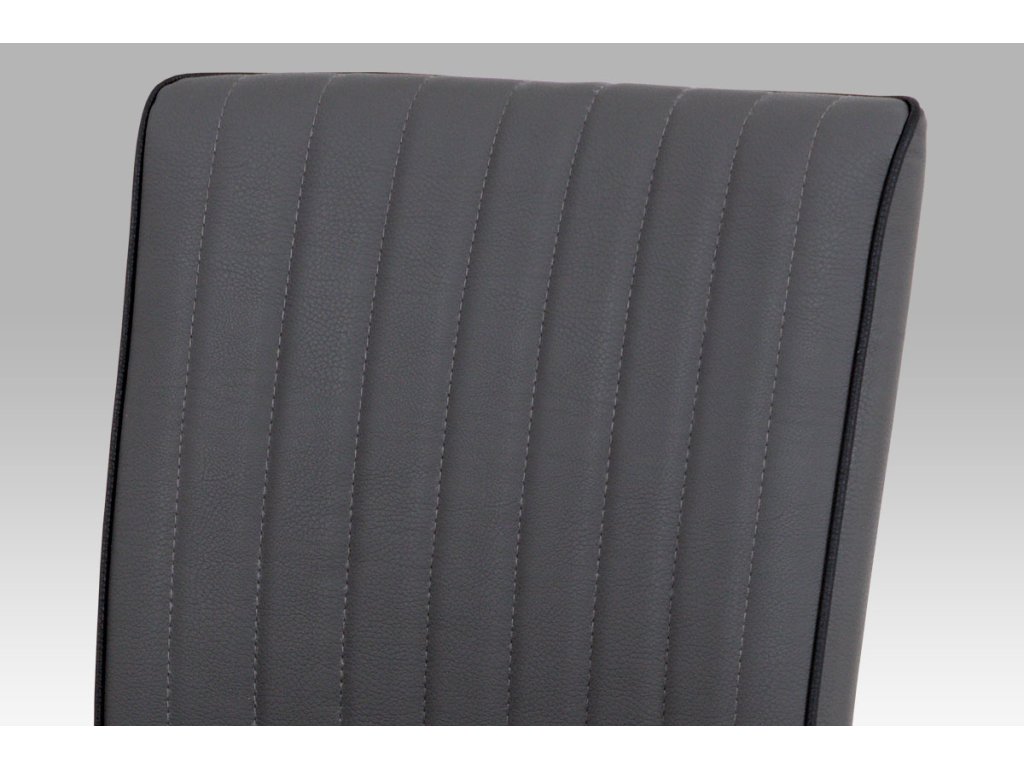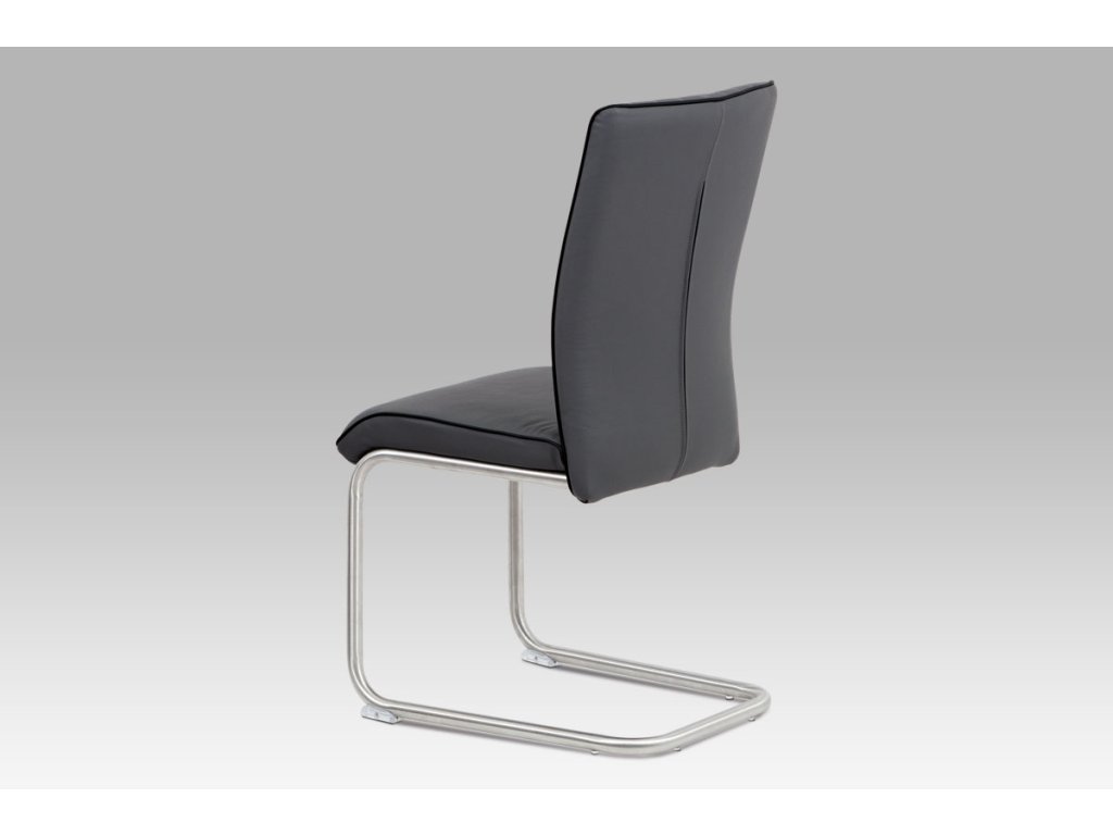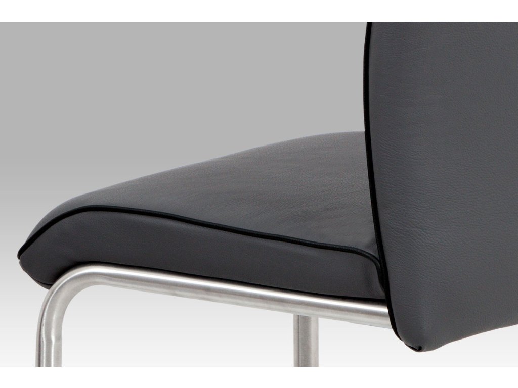 Retro designová židle je očalouněna ekokůží v šedé barvě, s ozdobným lemováním v černé barvě a podnoží z broušeného nerezu.