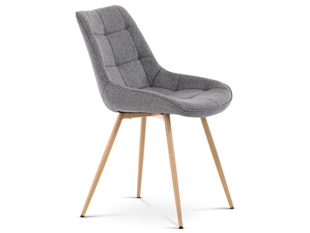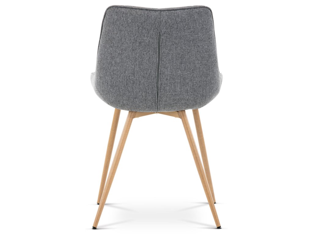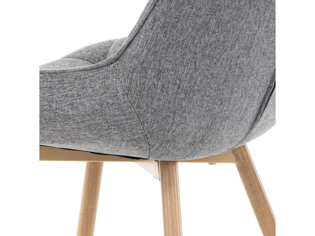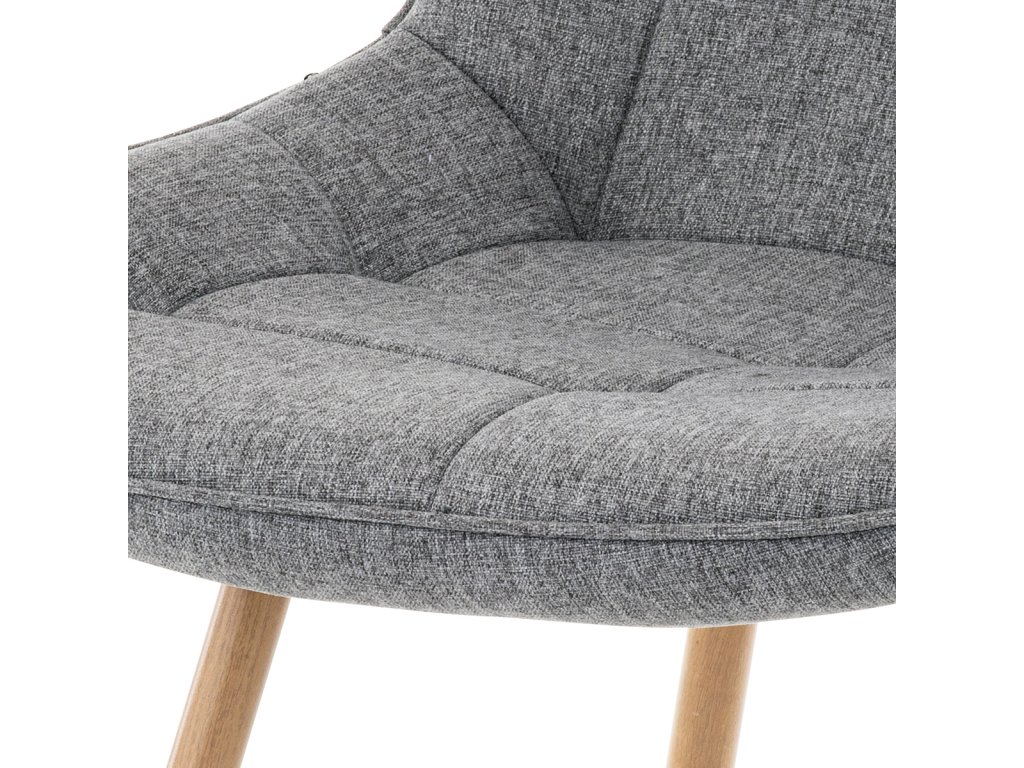 Designová skořepinová jídelní židle je čalouněna šedou látkou s výrazným prošitím sedací části i části určené k opření.