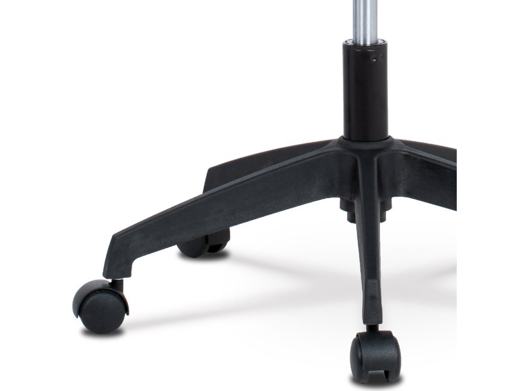 Kancelářská židle s výškově nastavitelnými područkami, pasivní bederní opěrkou a plastovým křížem s plastovými kolečky vhodnými na koberce.