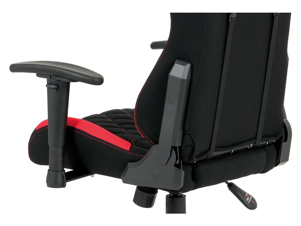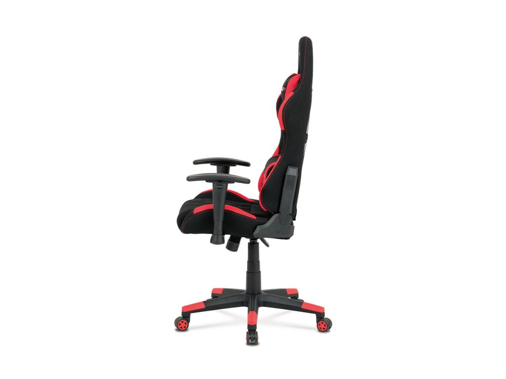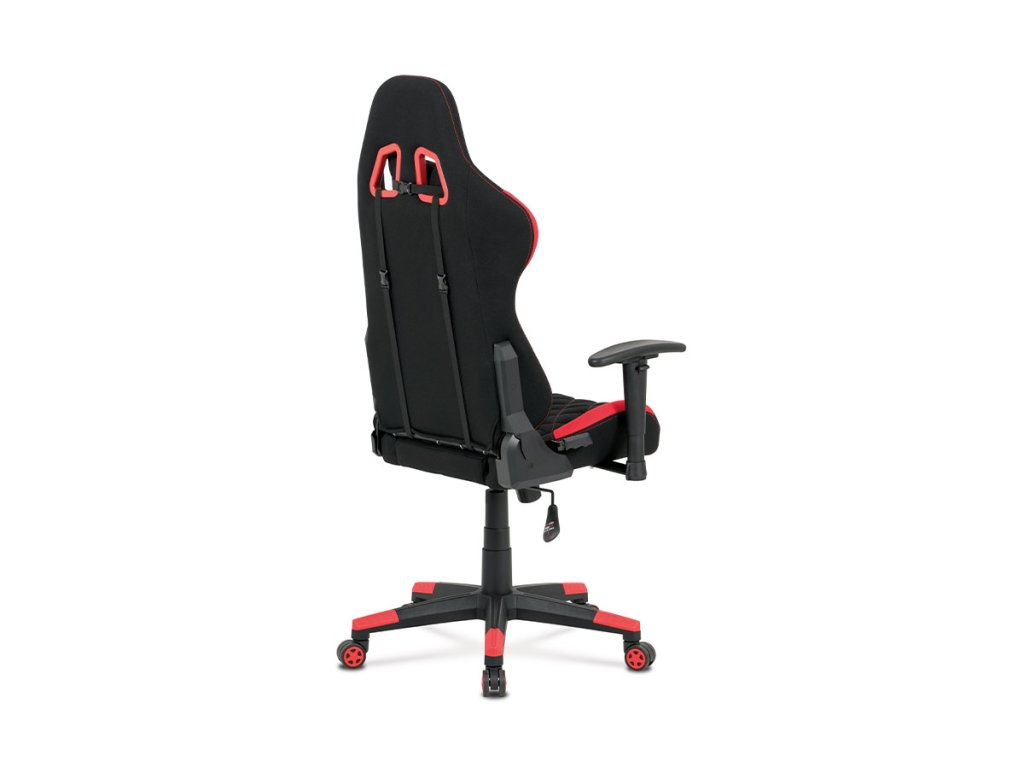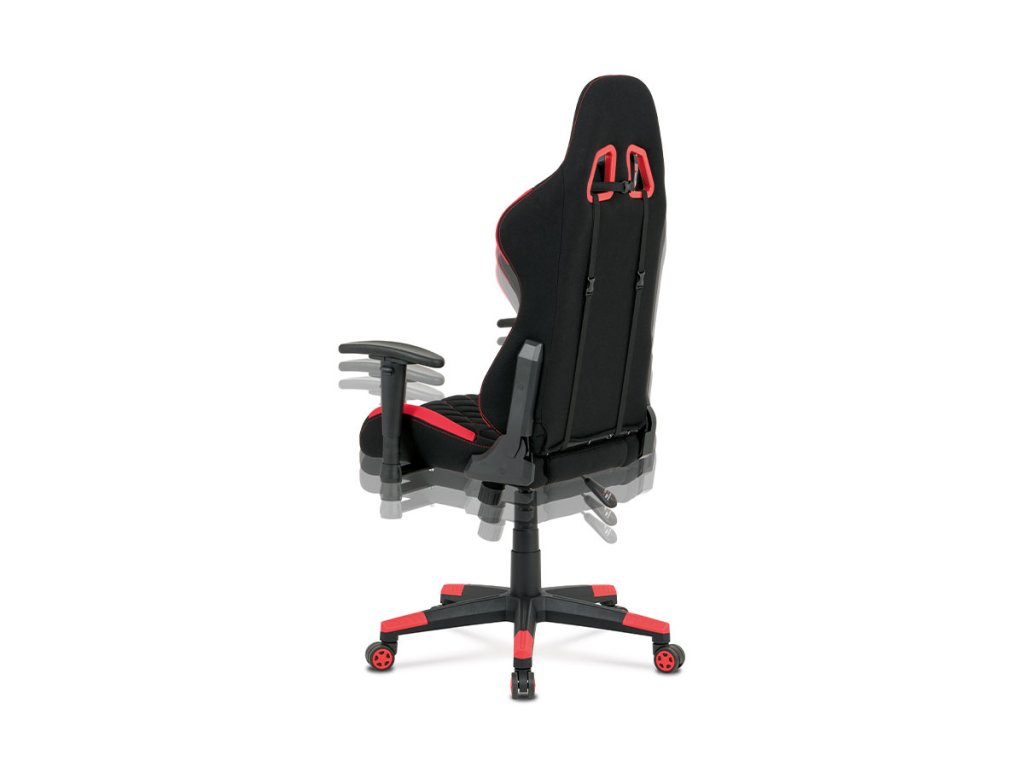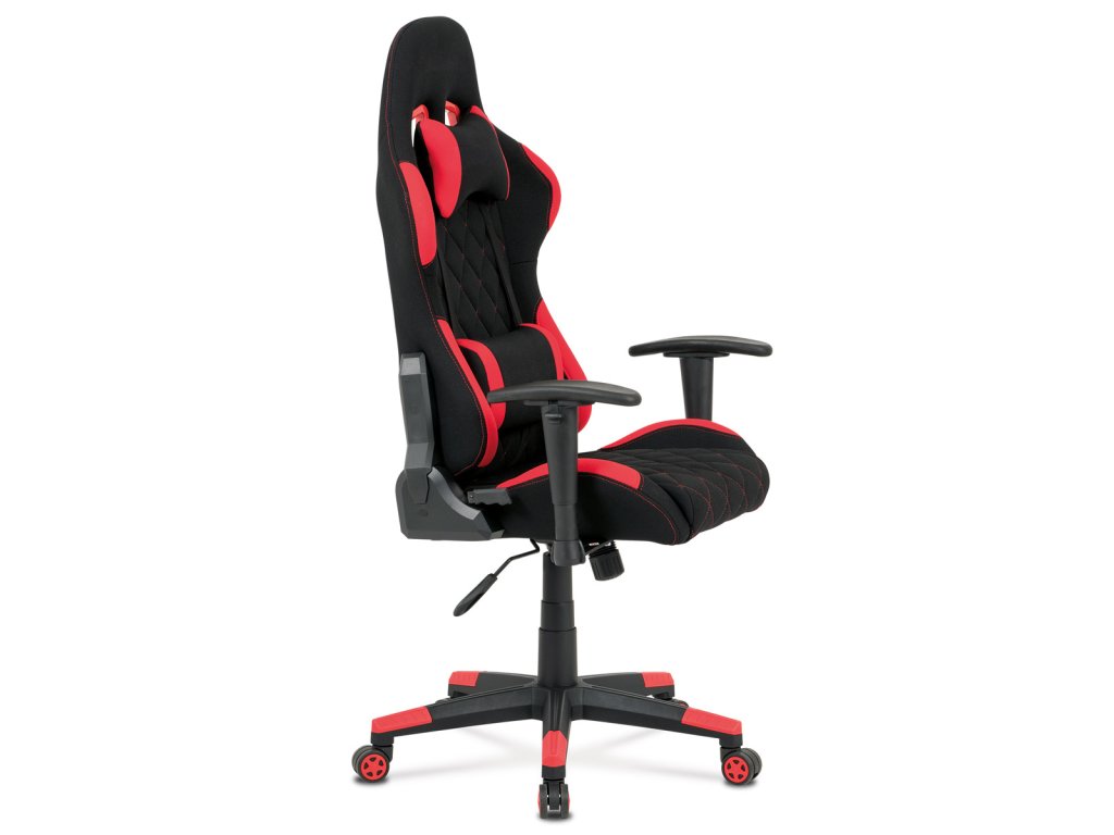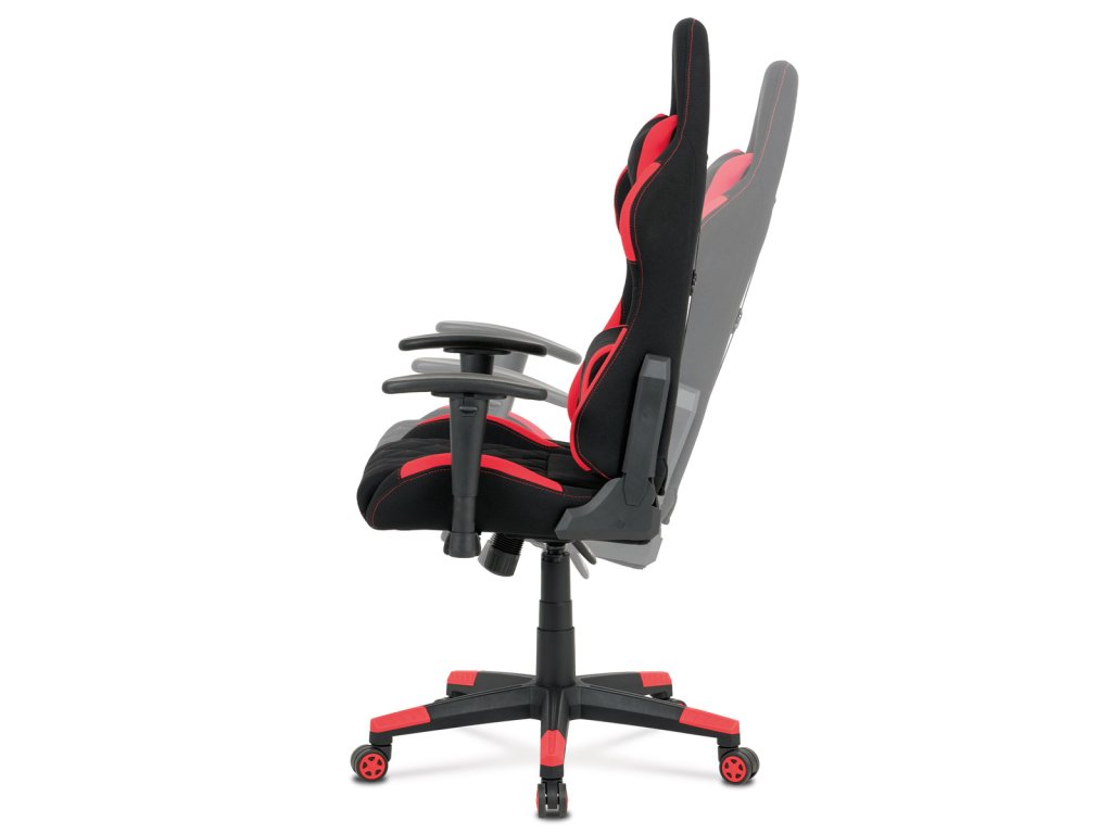 Židle je potažená černo-červenou látkou se stylovým šedým prošitím sedáku i opěráku.