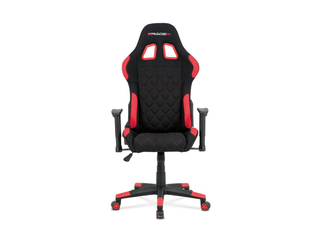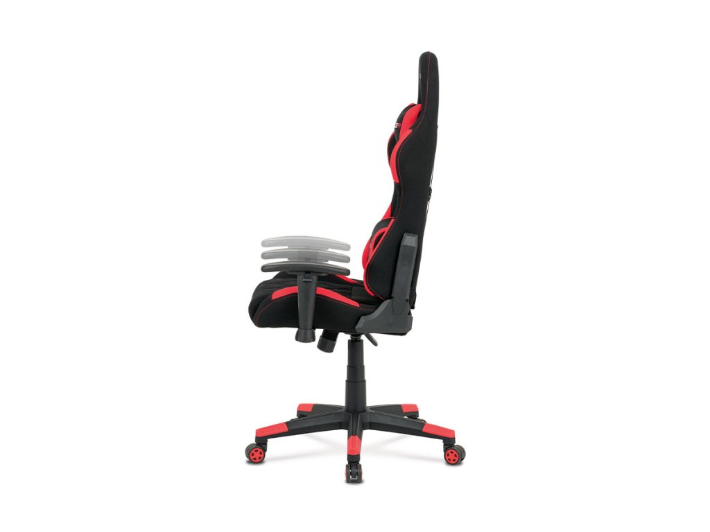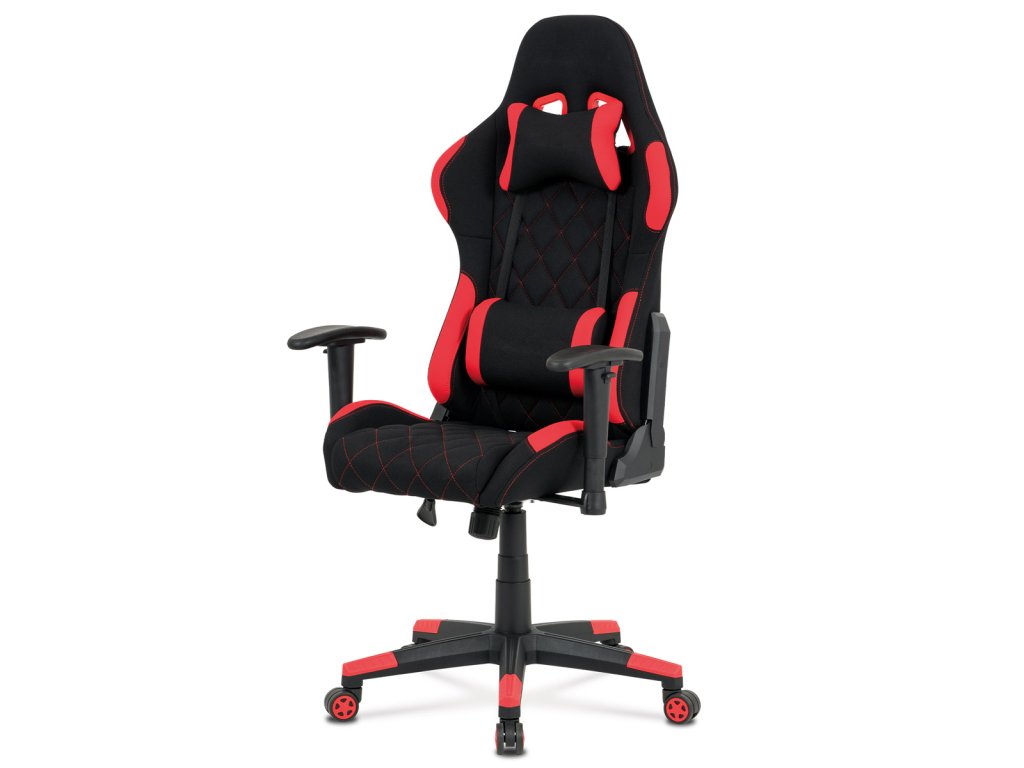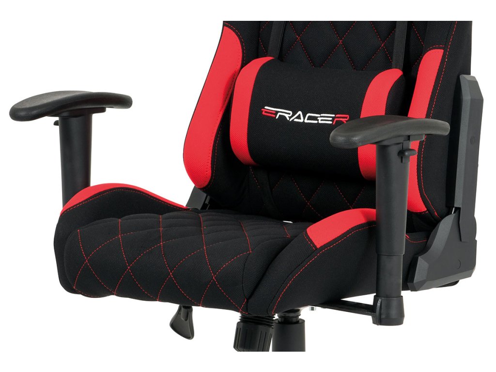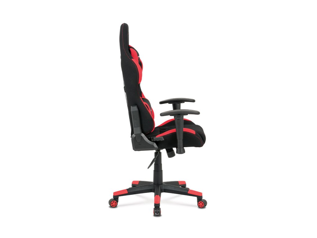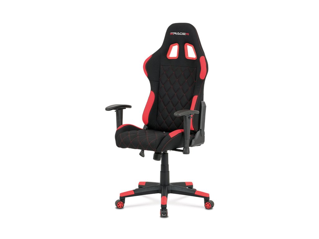 Židle je potažená černo-červenou látkou se stylovým šedým prošitím sedáku i opěráku.