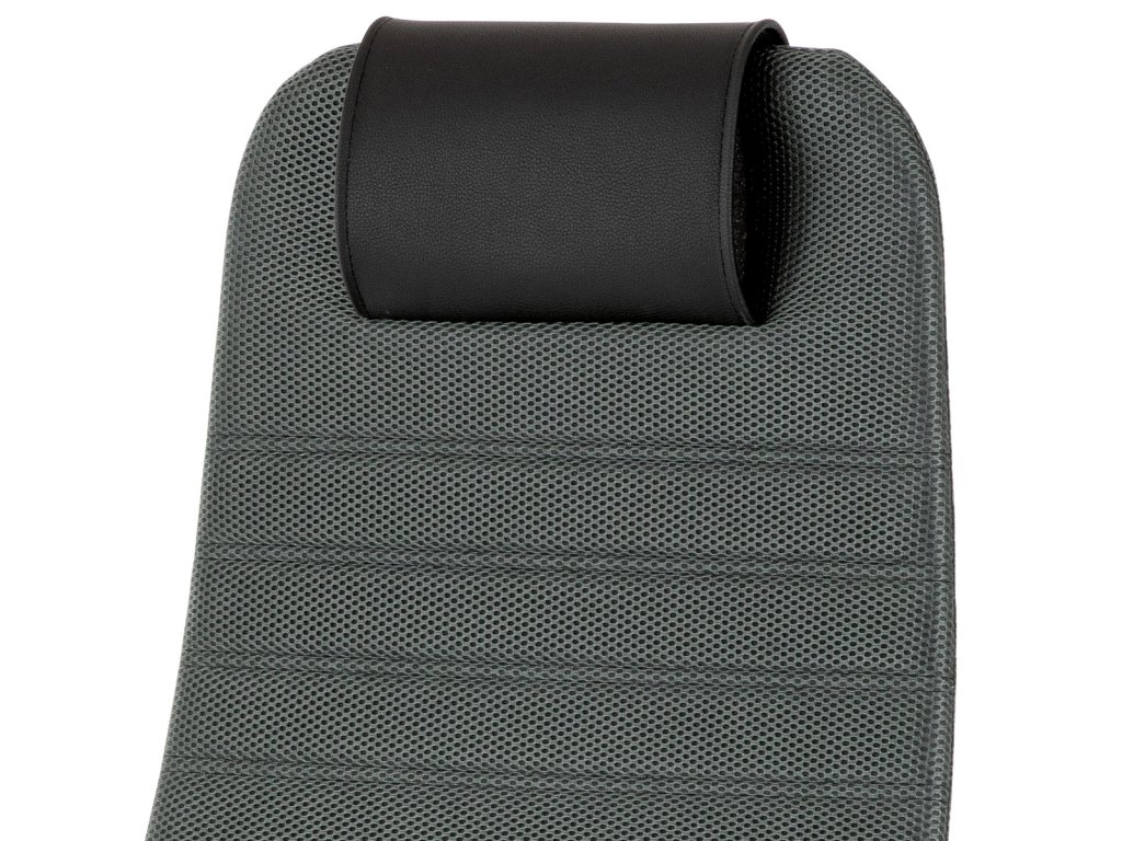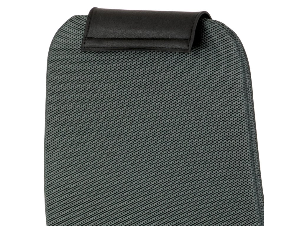 Na opěráku v tenké vrstvě, aby umožnila tělu „dýchat“. Hlavová opěrka je z černé ekokůže, vyplněná PU pěnou.