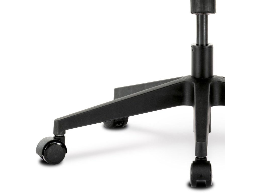 Masivní černý plastový kříž o průměru 64 cm je osazen černými kolečky vhodnými na koberce, područky jsou výškově nastavitelné z černého plastu, opěrka je měkčená a navíc posuvná vpřed / vzad, šíře područky je 9 cm, delká 25 cm a výška 3 cm, nosnost židle je 120 kg.