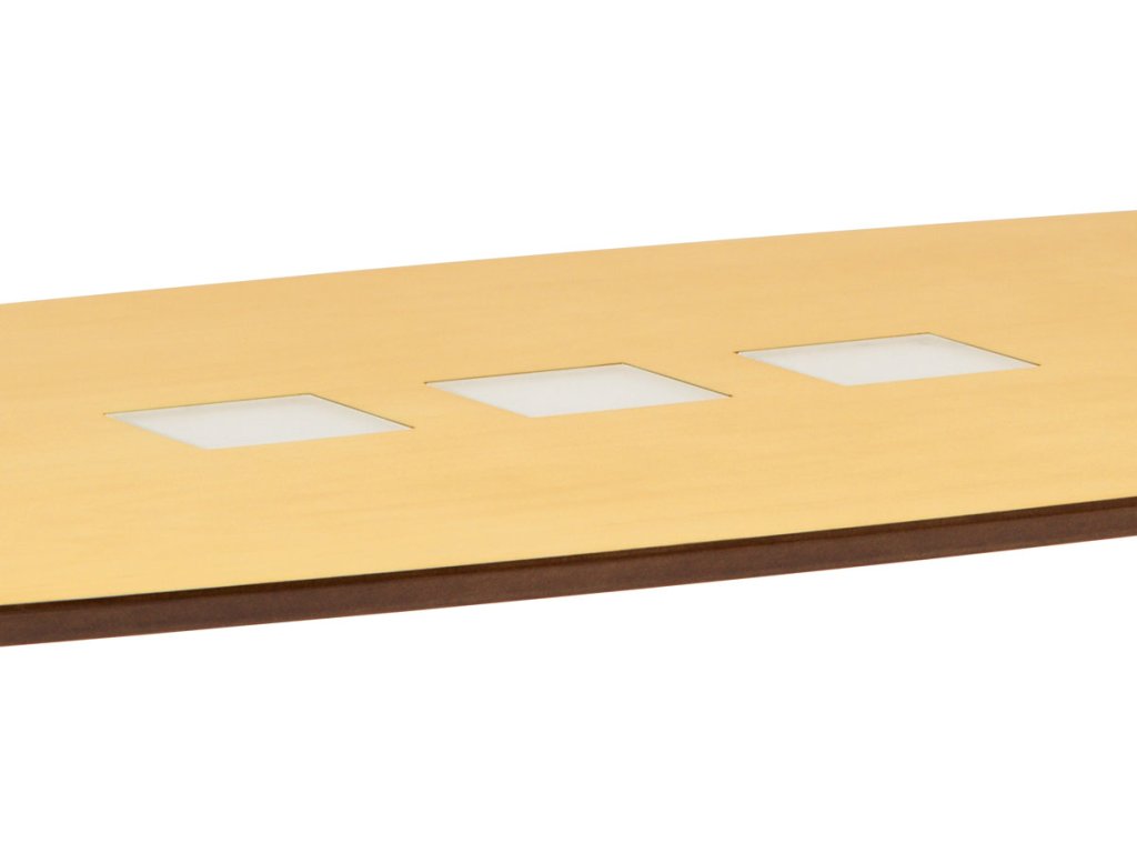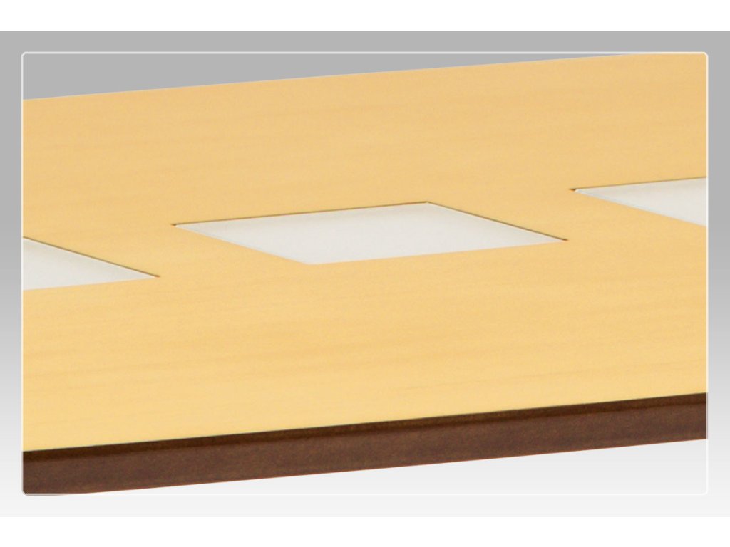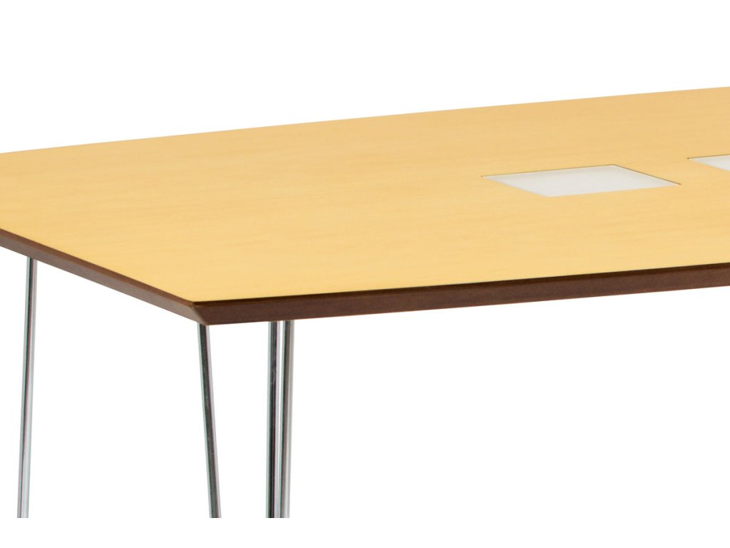 Minimalistický stůl s kovovýma nohama a dýhovou desku v přírodním odstínu ozvláštněnou zajímavými detaily ve tvaru čtverců.