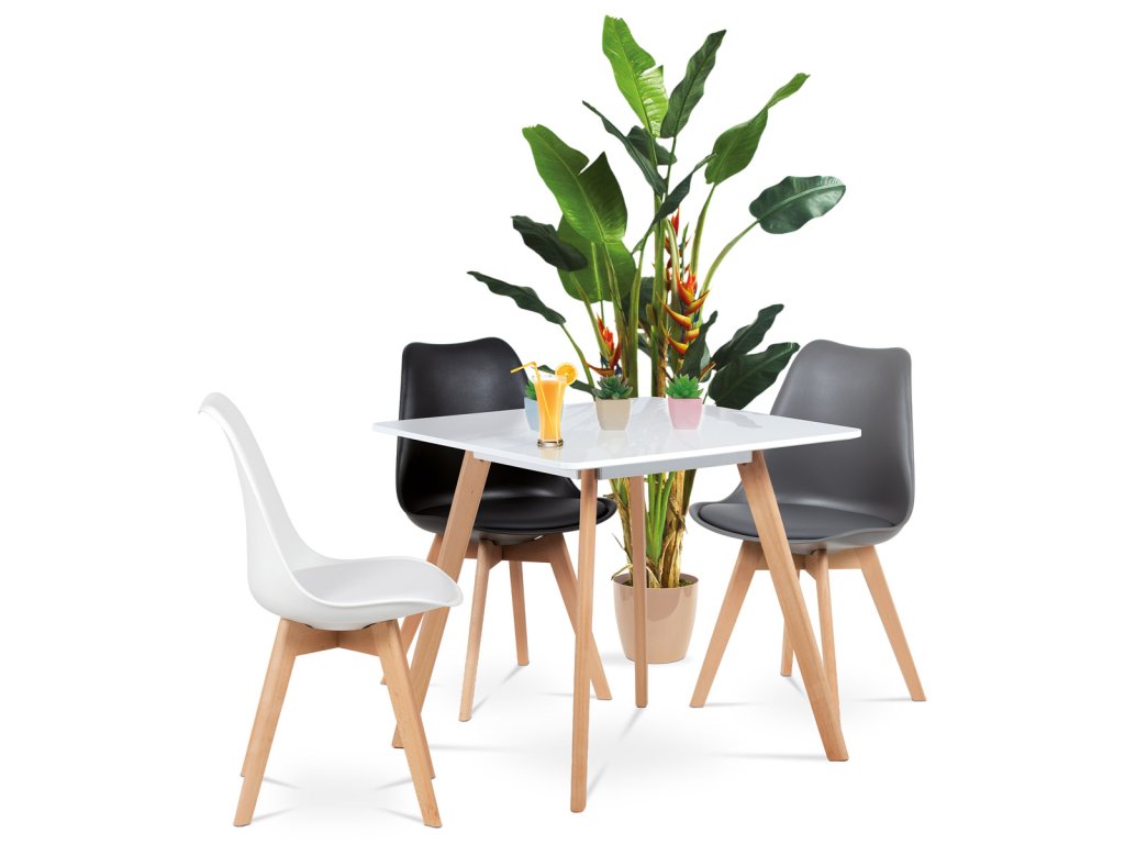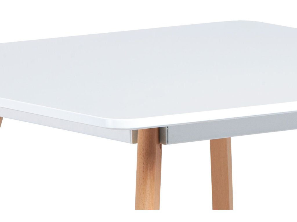 Moderní jídelní stůl s MDF deskou čtvercového tvaru, která je lakována bílou matnou barvou a je 2 cm vysoká.