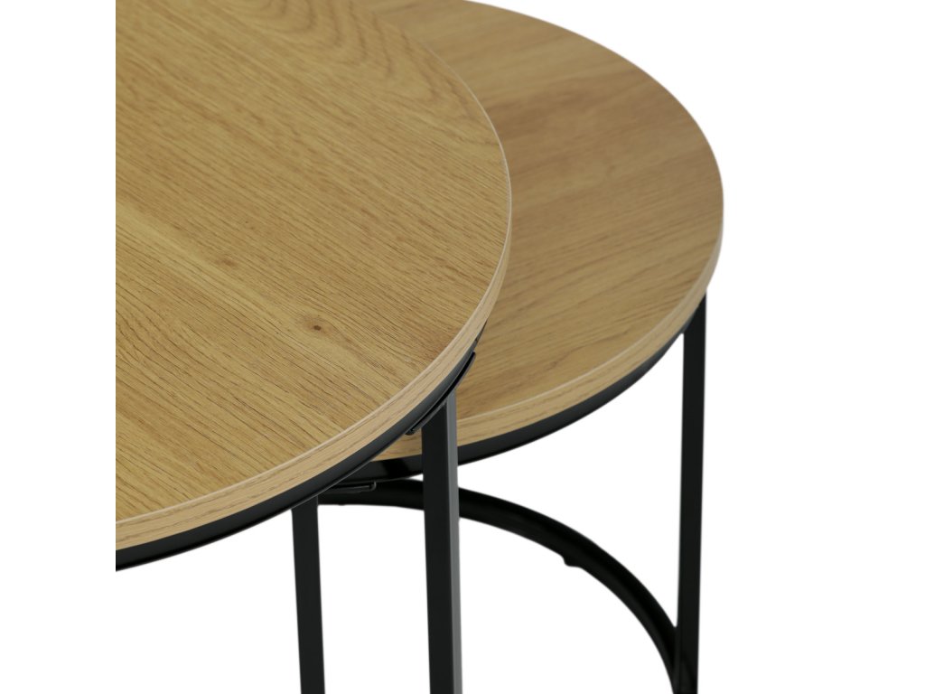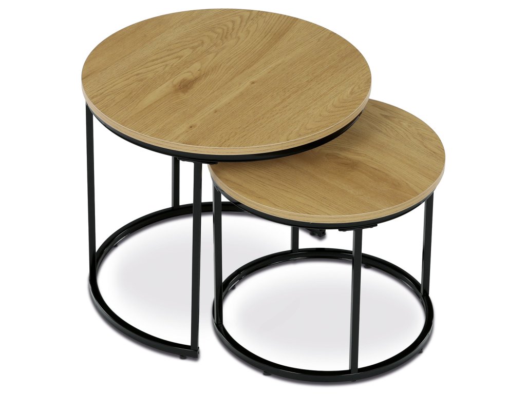 Kulaté desky v přírodním dekoru skvěle kontrastují s černými kovovými nohami, což vytváří elegantní industriální vzhled.