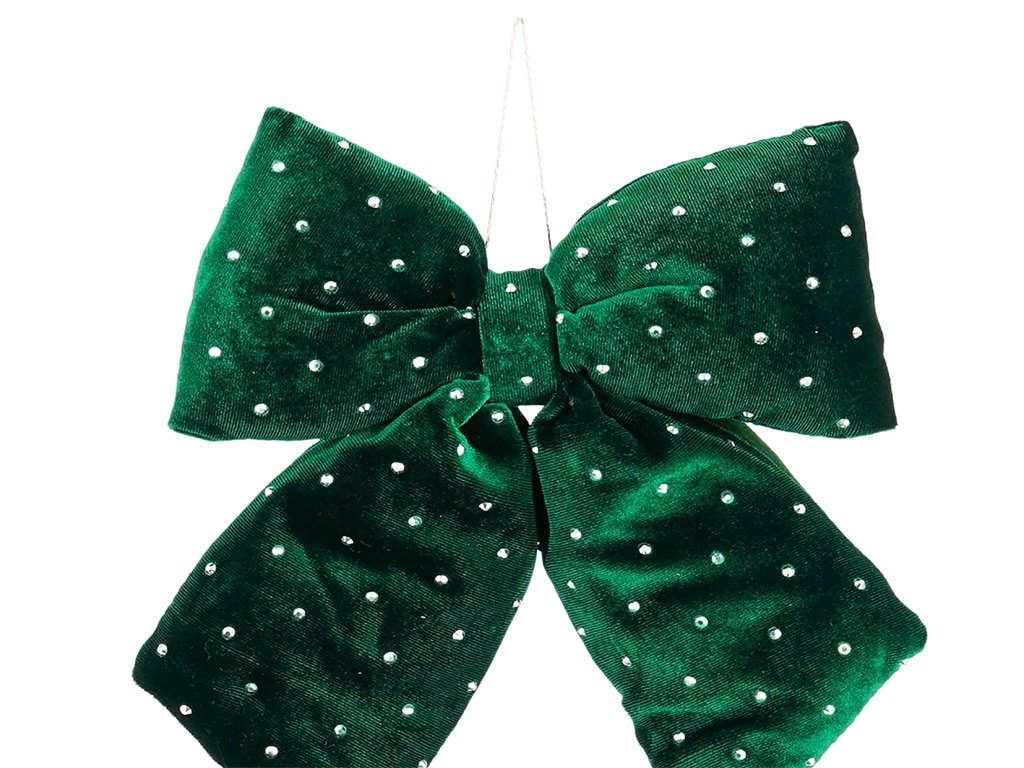 Elegantní zelená saténová mašle zdobená jemnými kamínky dodá Vašim vánočním dekoracím luxusní vzhled.