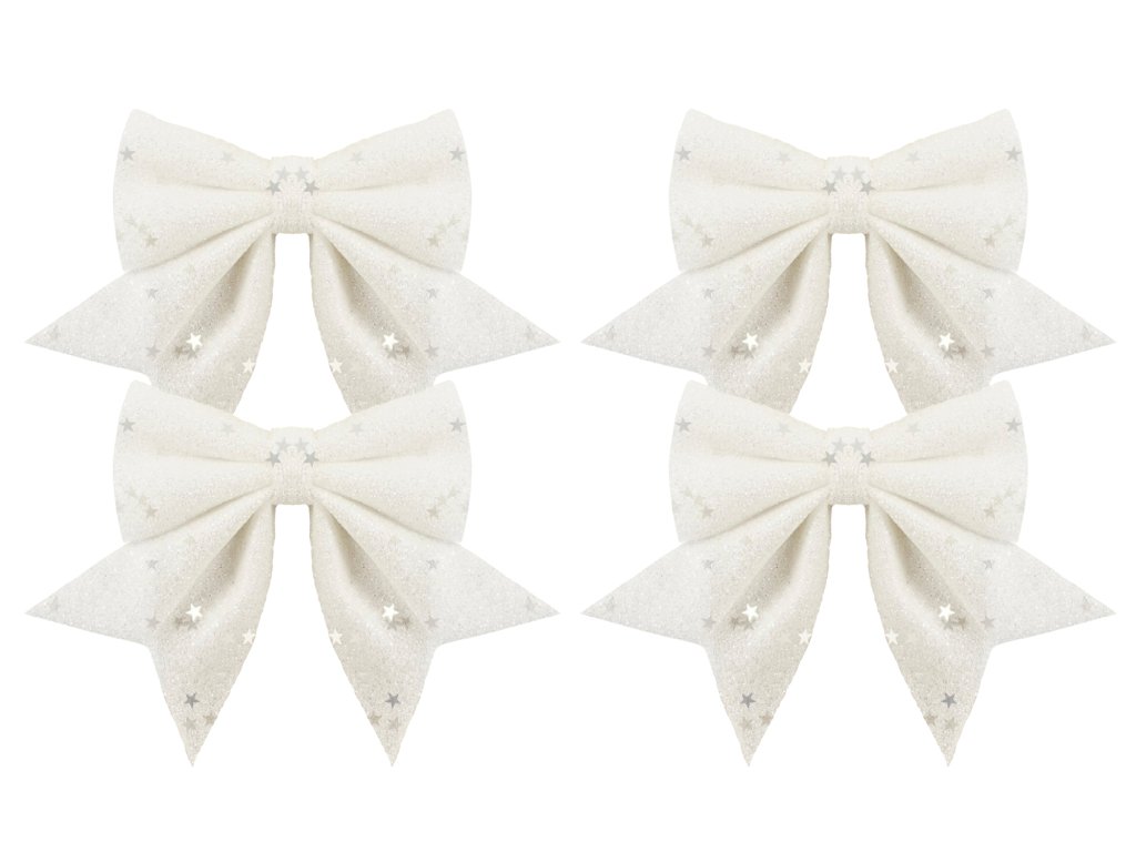 Tato sada obsahuje 4 kusy bílých mašlí s glitry, které dodají vánoční výzdobě jiskru a eleganci.