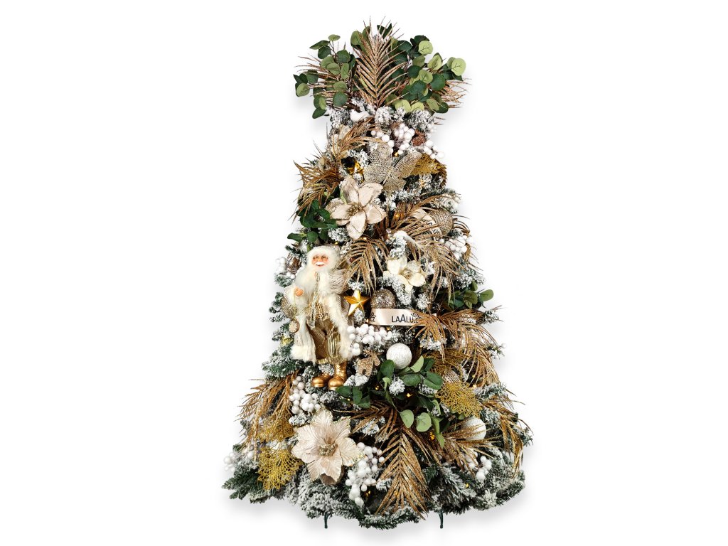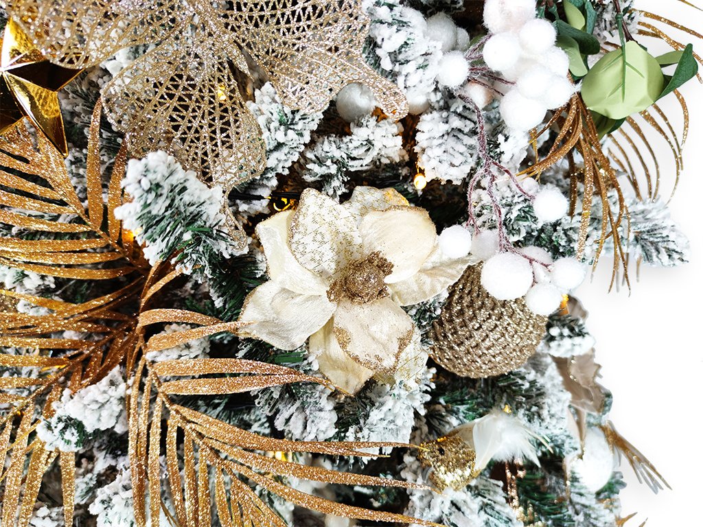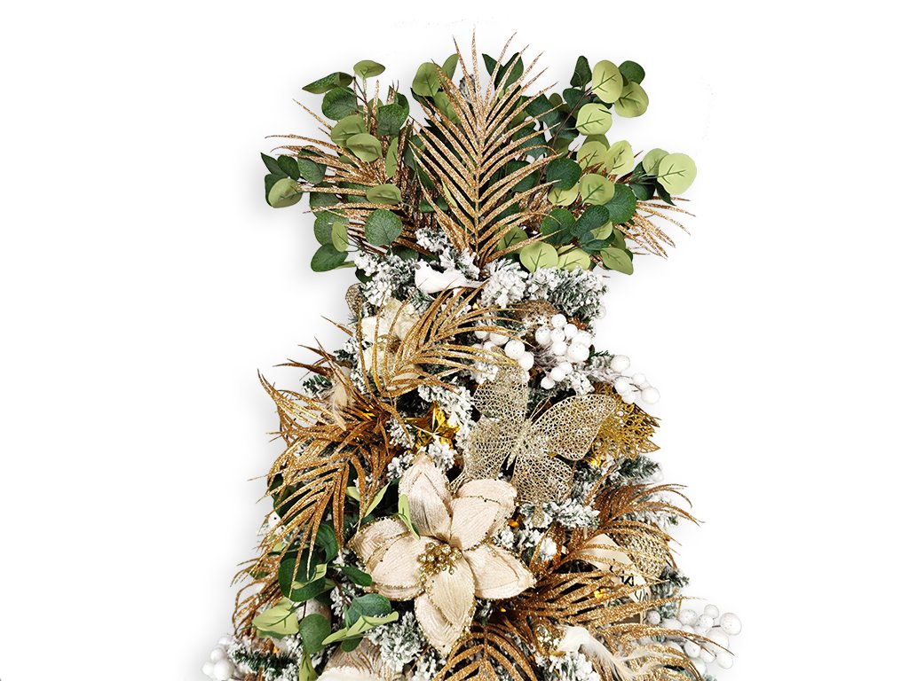 Dekorační listy v odstínech champagne, společně s bílou a zelenou barvou dodají stromečku moderní a luxusní vzhled.