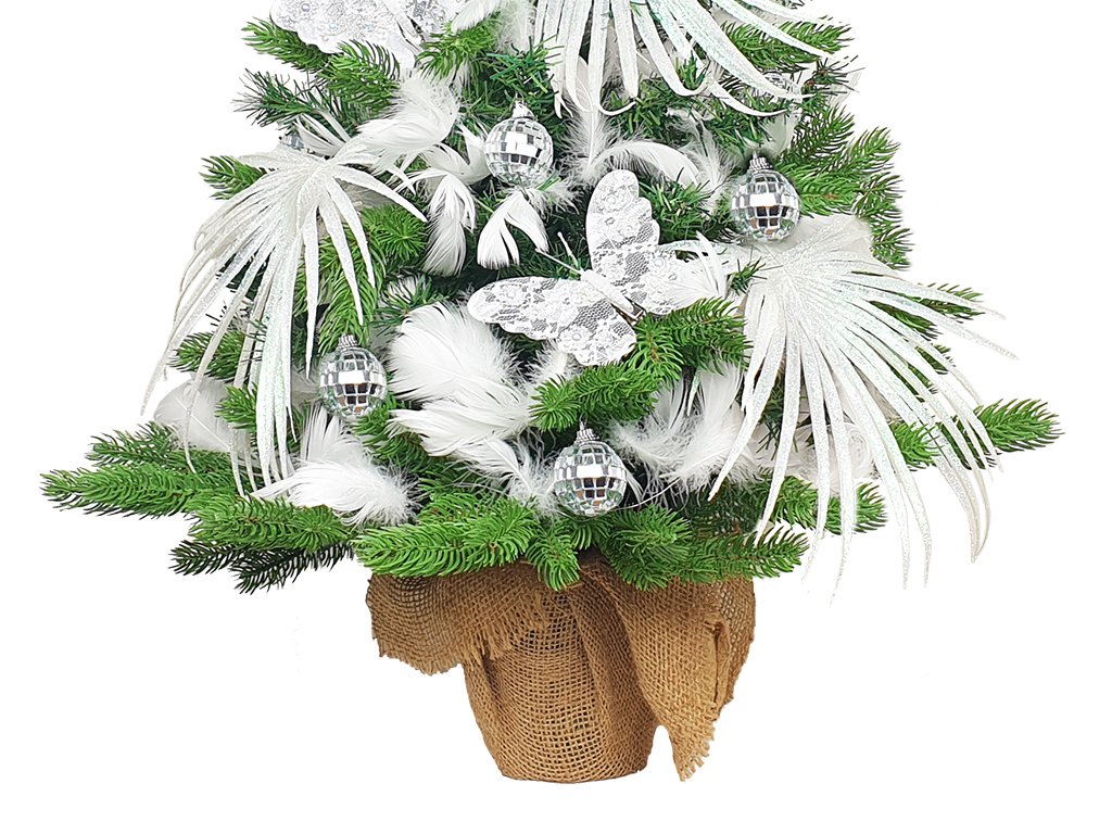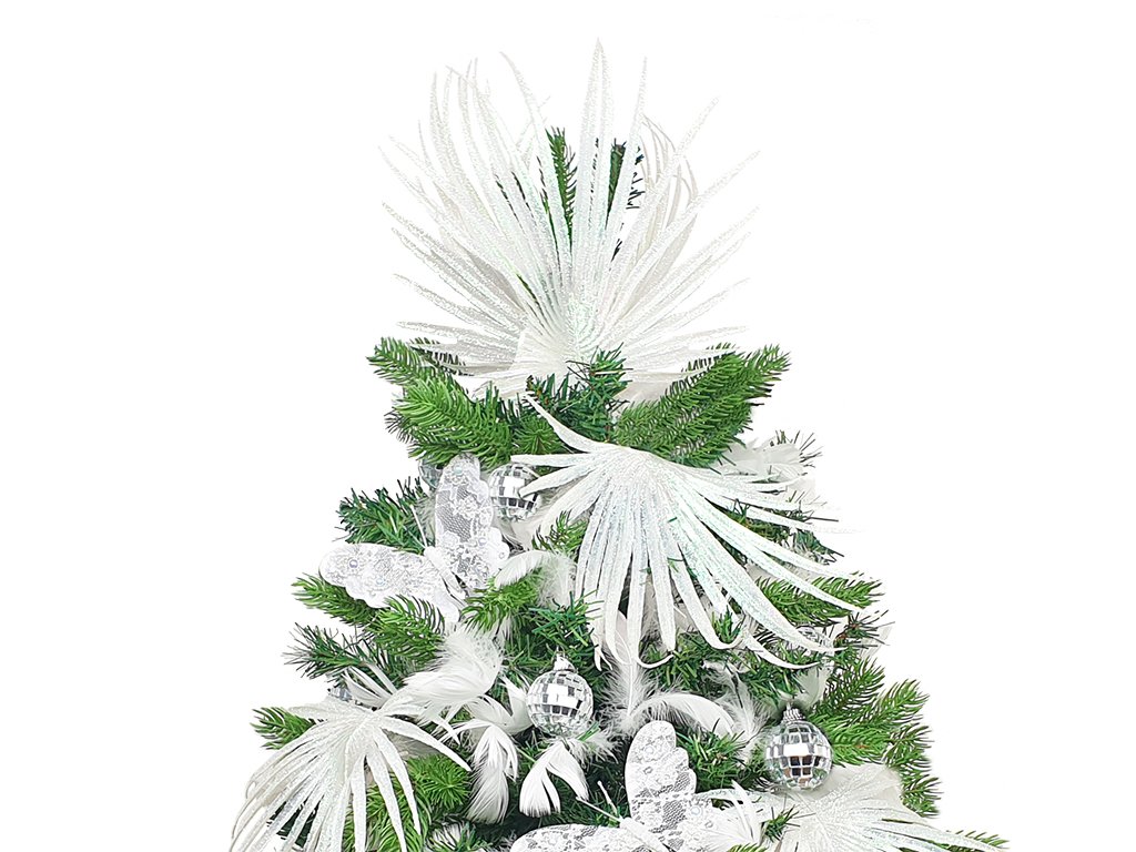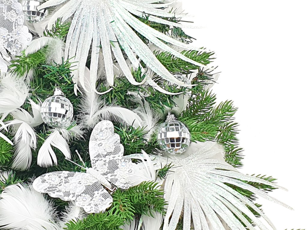 Celým stromečkem je propleteno peří ve sněhové bílé barvě, který doplňují nádherní motýlci.