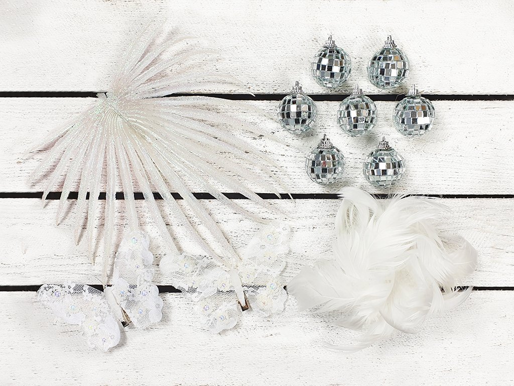Dekorační listy v bílé barvě s jemnými glitry a trendy ozdobičky v designu disco koulí dodávají neodolatelný šmrnc.