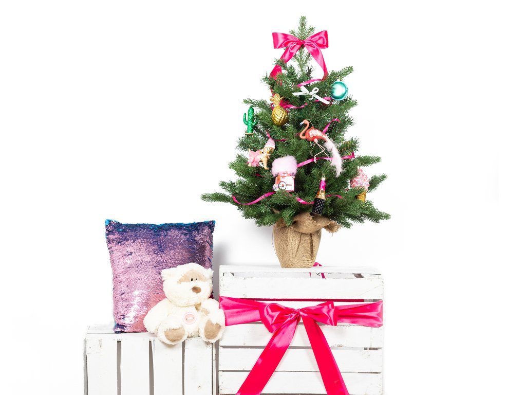 Náš vánoční stromek v květináči je pokryt originálními, ručně vyráběnými ozdobami v podobě zlatého ananasu, růžového plameňáka či zeleného třpytivého kaktusu.