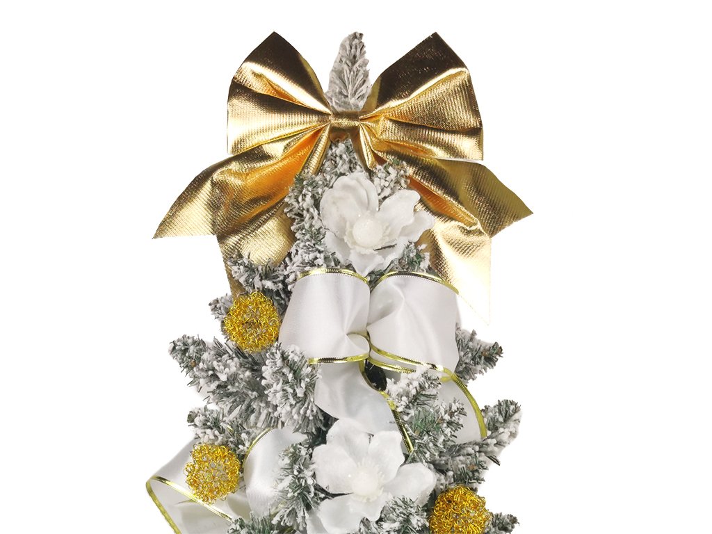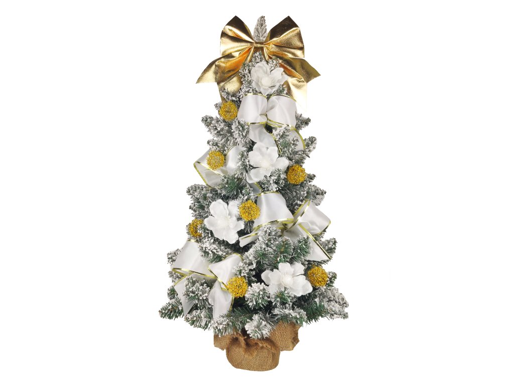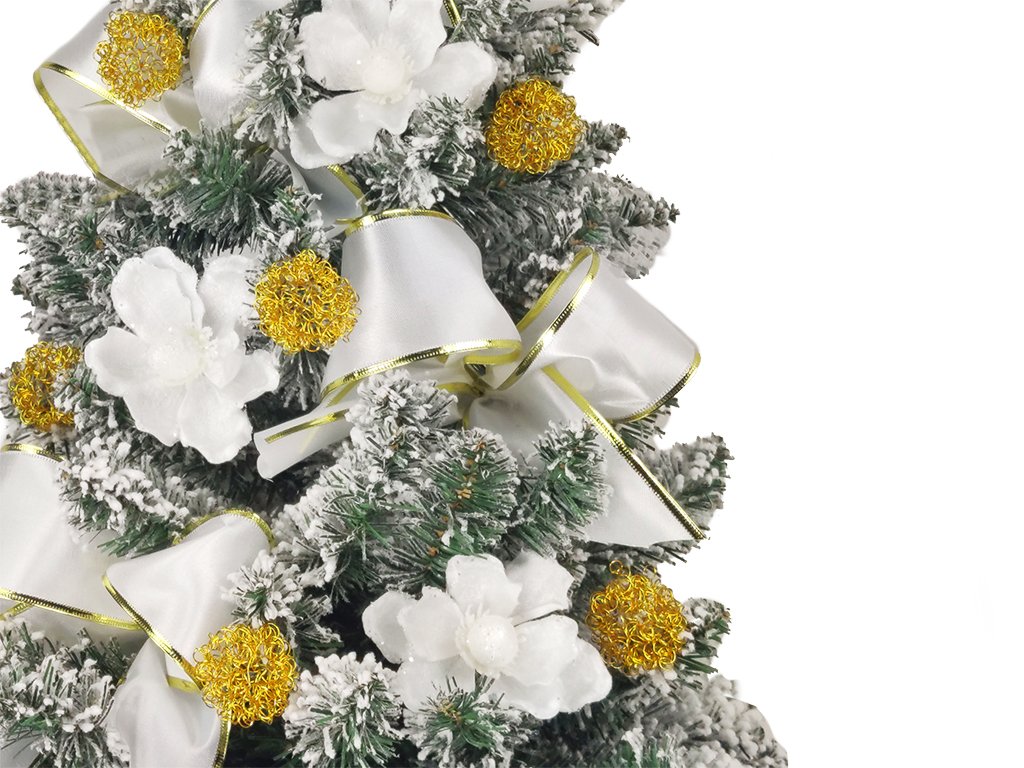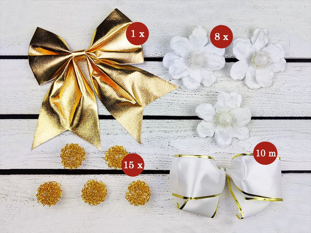 Základem sady je bílá stuha se zlatým lemem, která je propletena celým stromečkem a vytváří jemný vzhled stromečku.