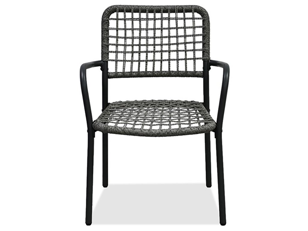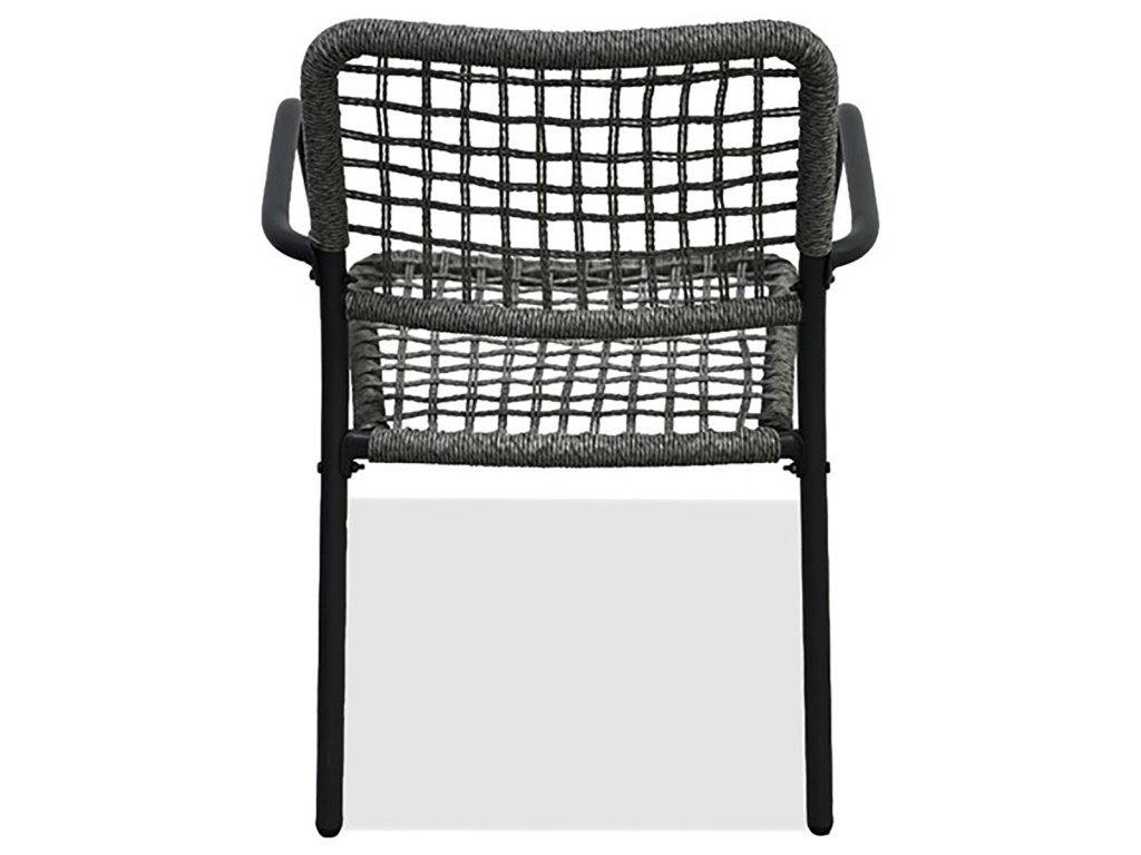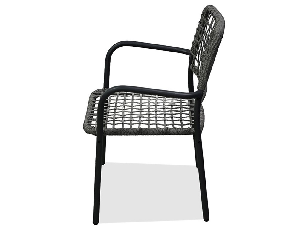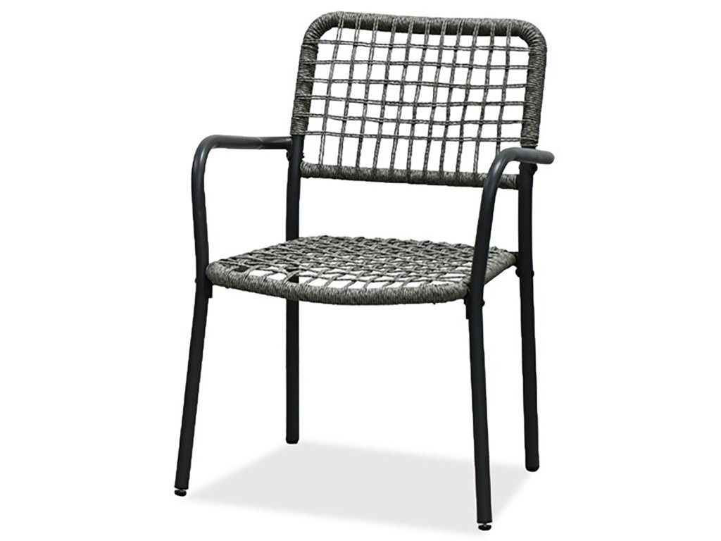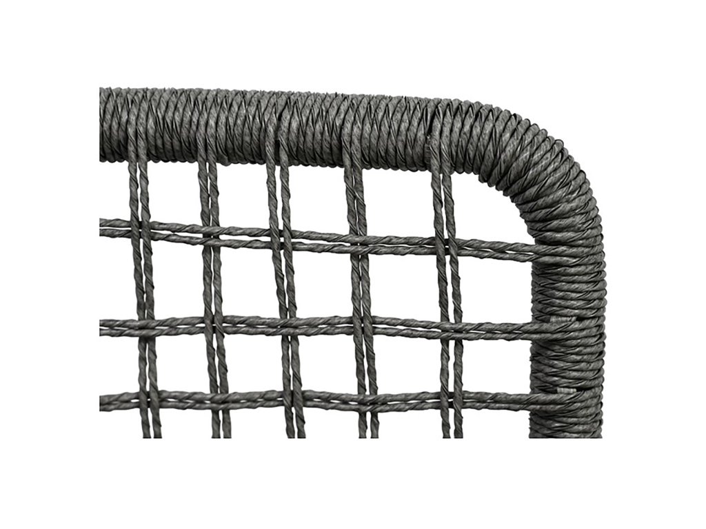 Židle jsou vyrobeny z pevného polyratanu v šedém odstínu a mají stabilní kovovou konstrukci s práškovou povrchovou úpravou v antracitové barvě, která zajišťuje odolnost vůči venkovním vlivům.