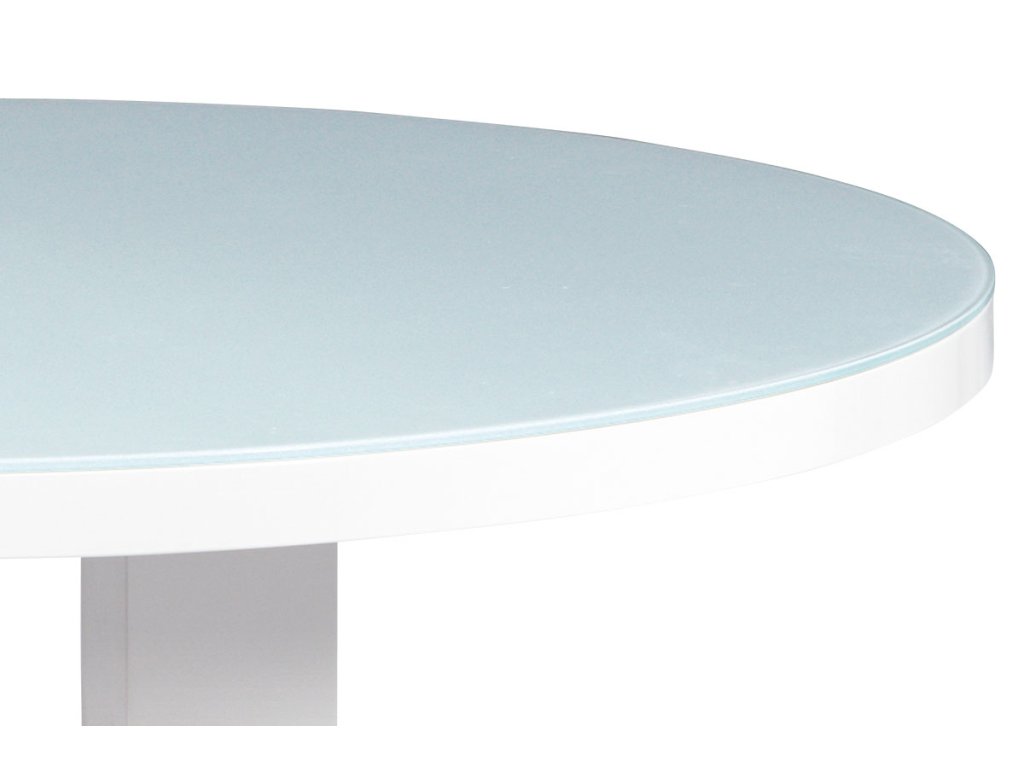 Kulatý podstavec z 3,5 cm vysoké MDF bílé barvy ve vysokém lesku zajišťuje maximální stabilitu a snižuje riziko překlopení stolu.