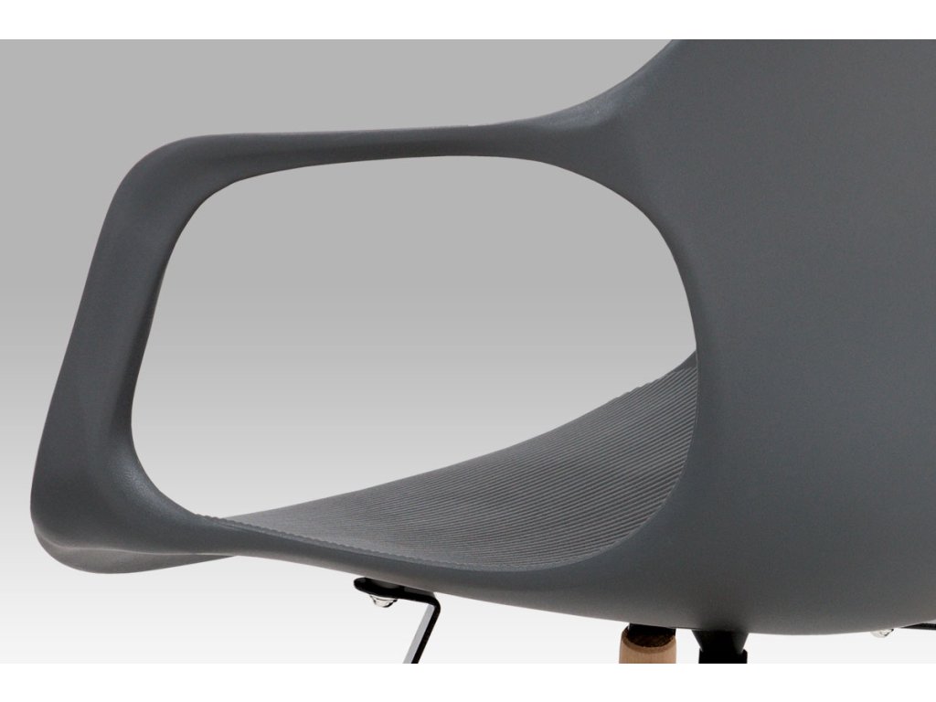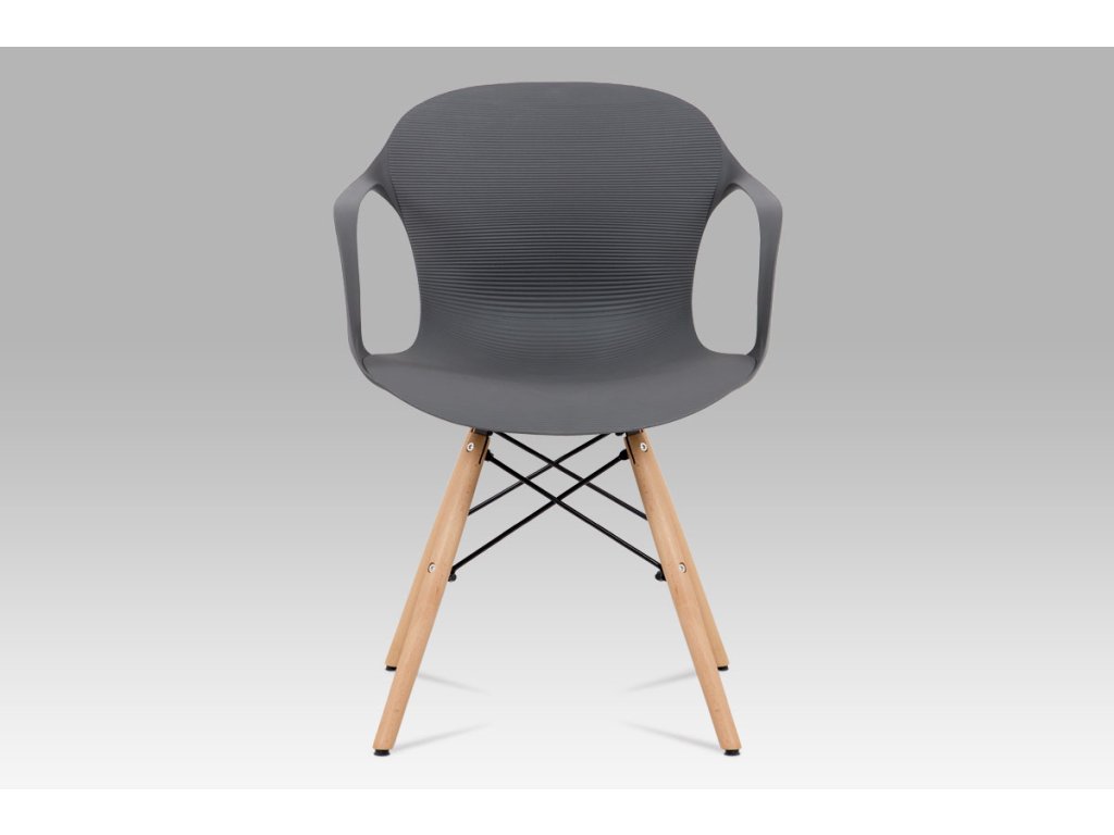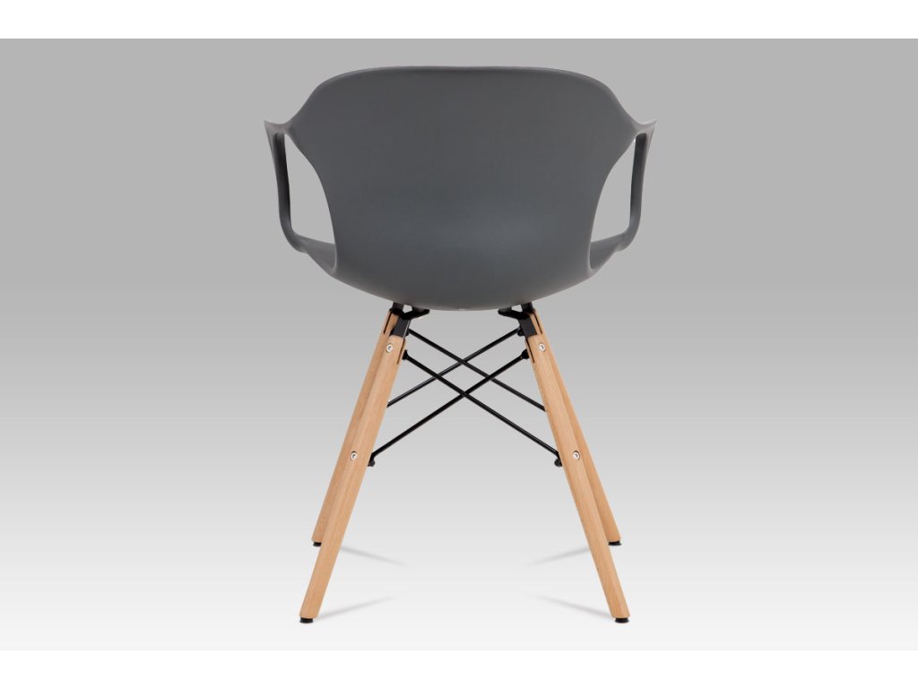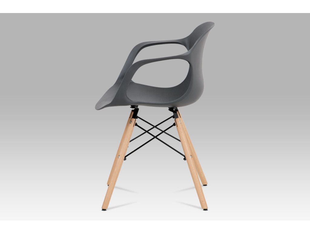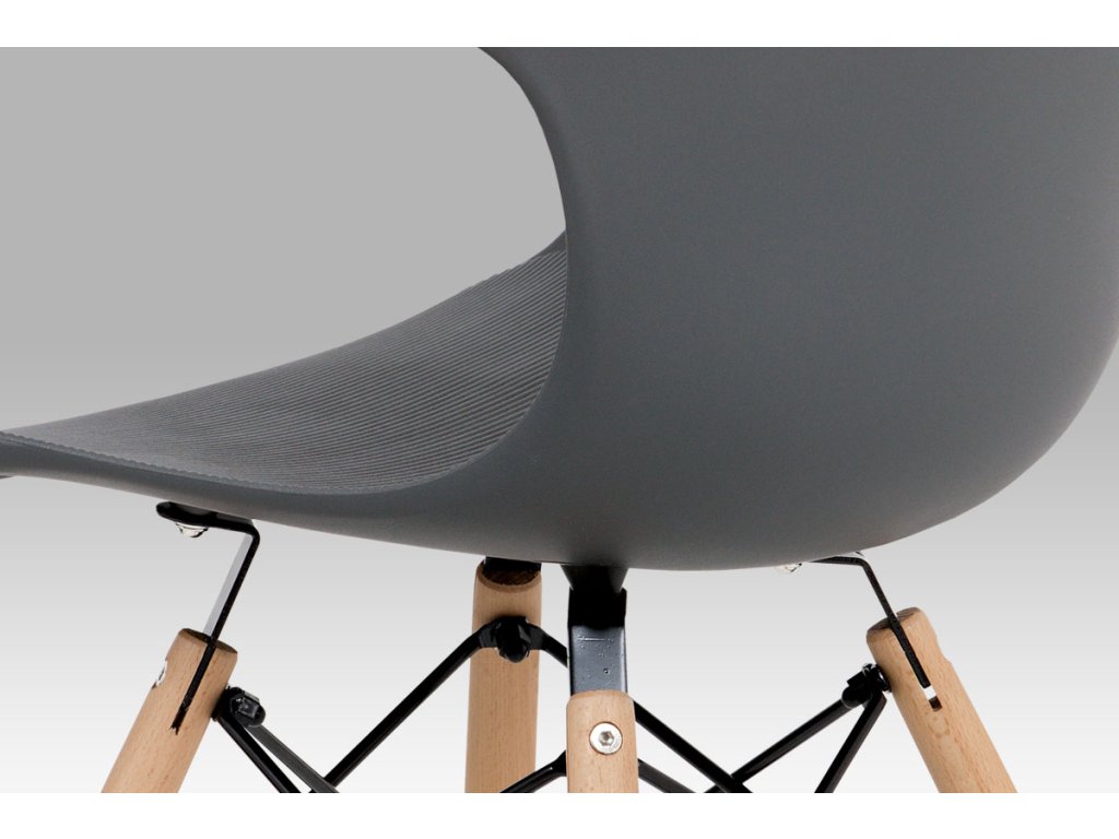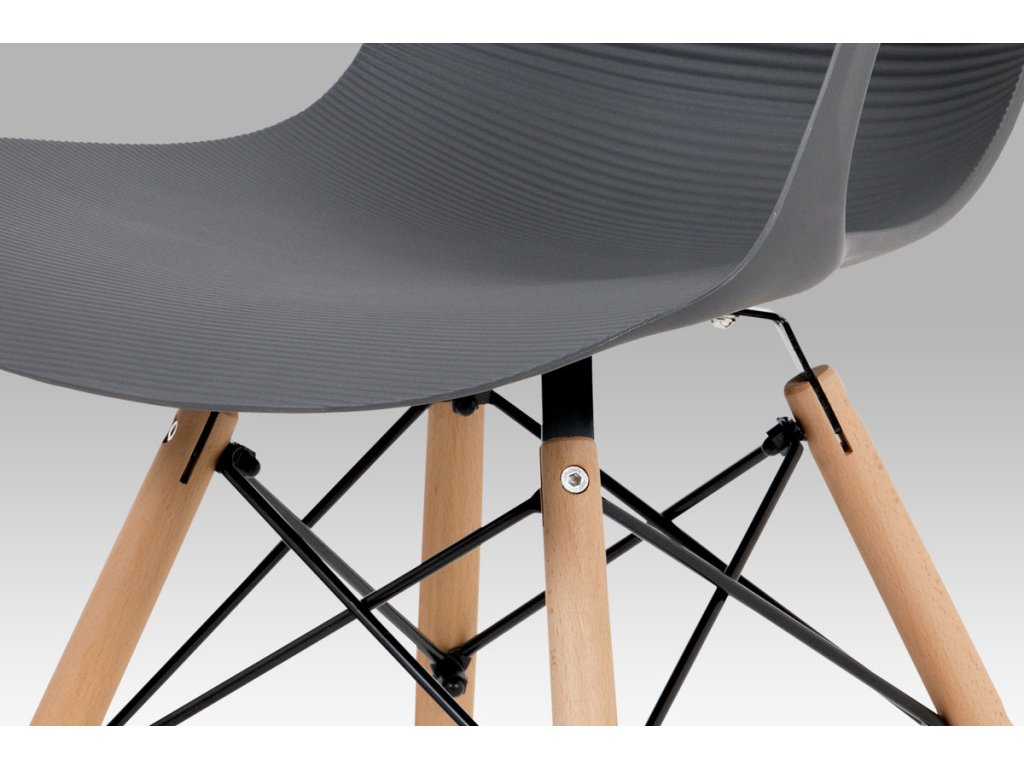 Zajímavě řešená podnož z masivního bukového dřeva v barvě natural s černými kovovými výztuhami, šedý sedák je z plastu ABS.