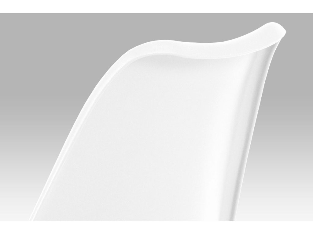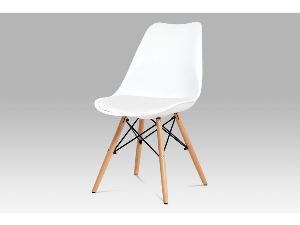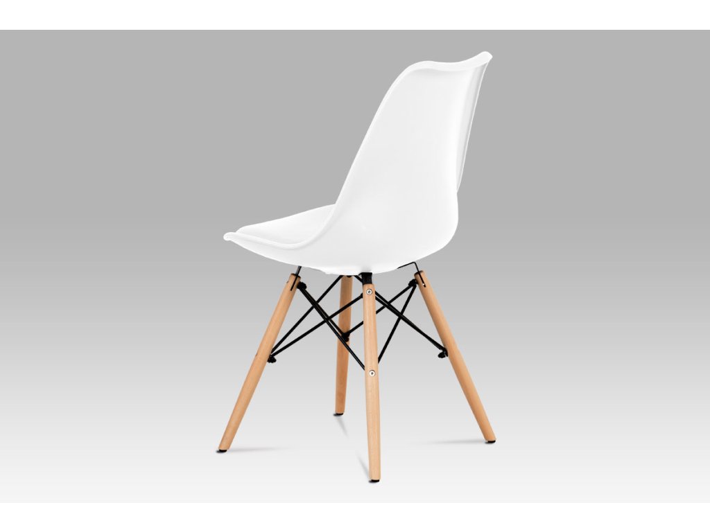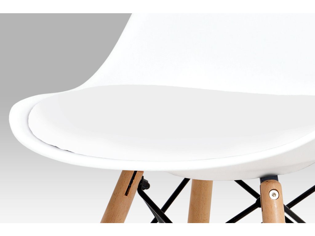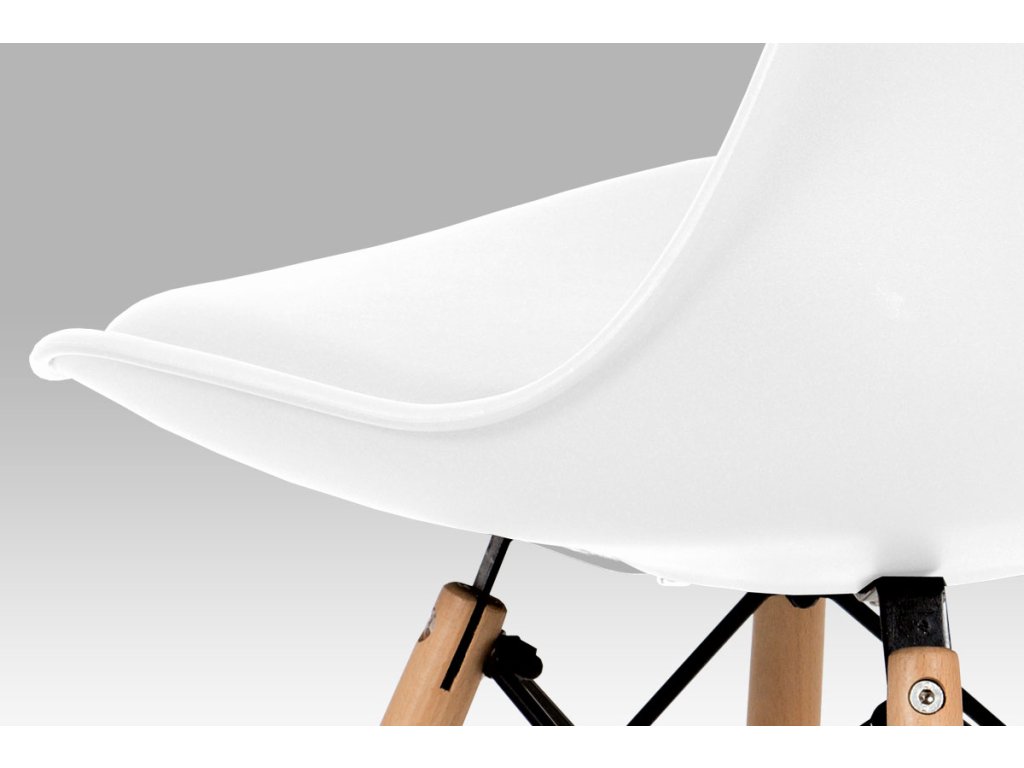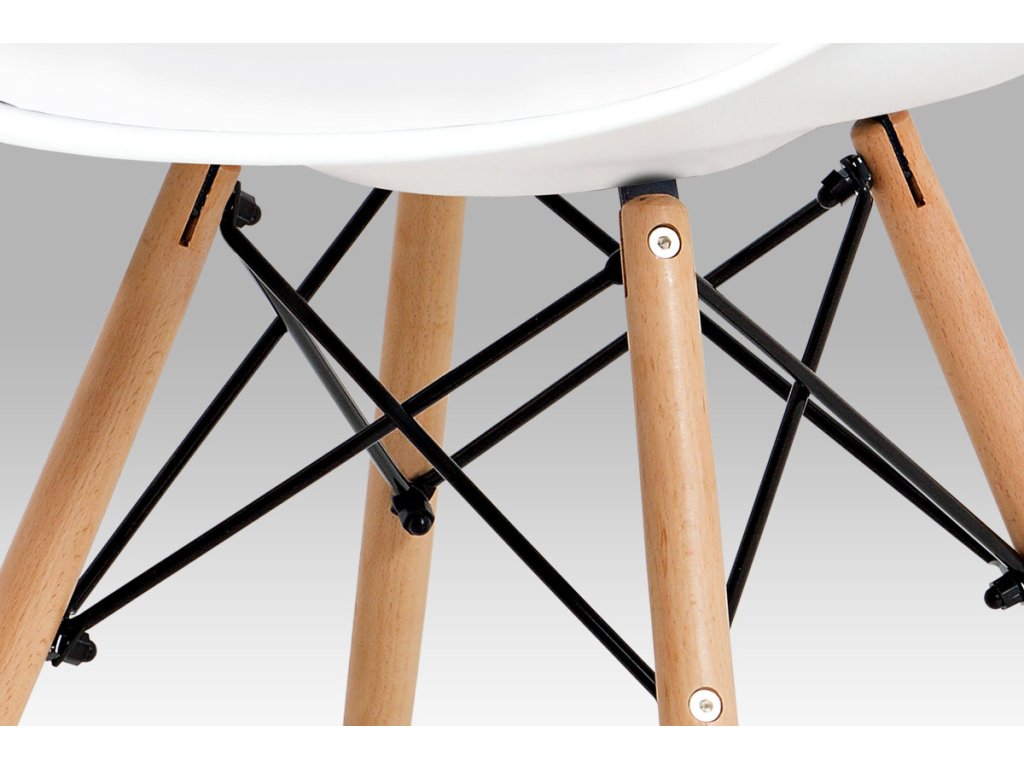 Zajímavě řešená podnož z masivního bukového dřeva v barvě natural s černými kovovými výztuhami, skořepina z bílého ABS plastu, sedák očalouněn koženkou. Nosnost této židle je do 110 kg.