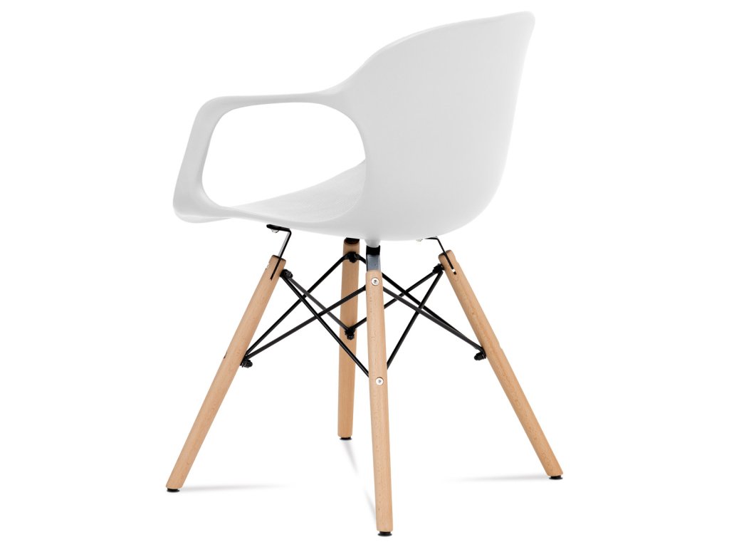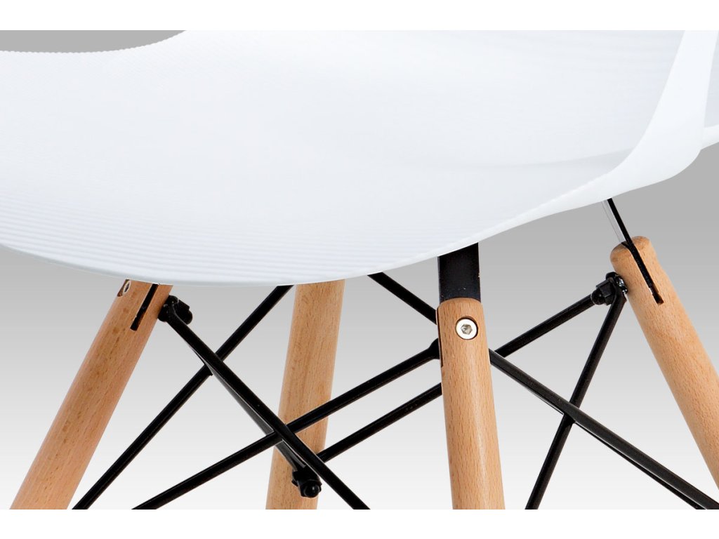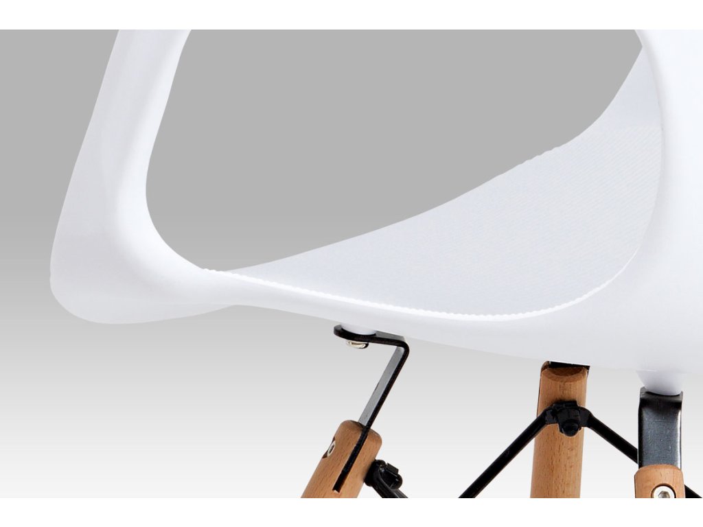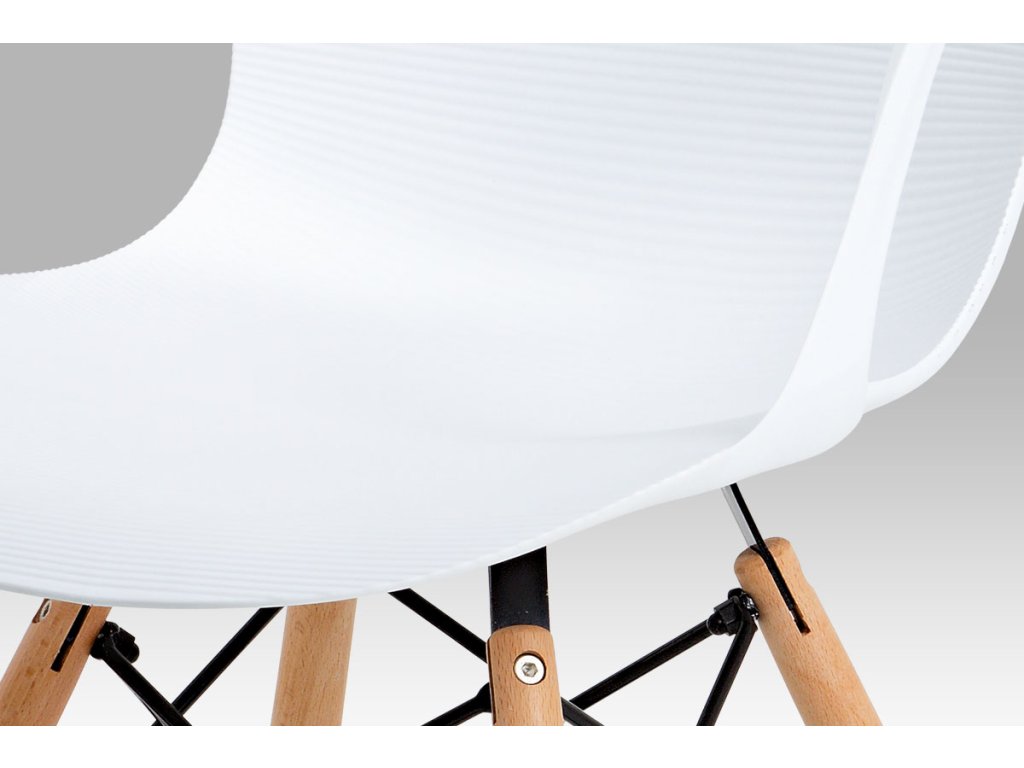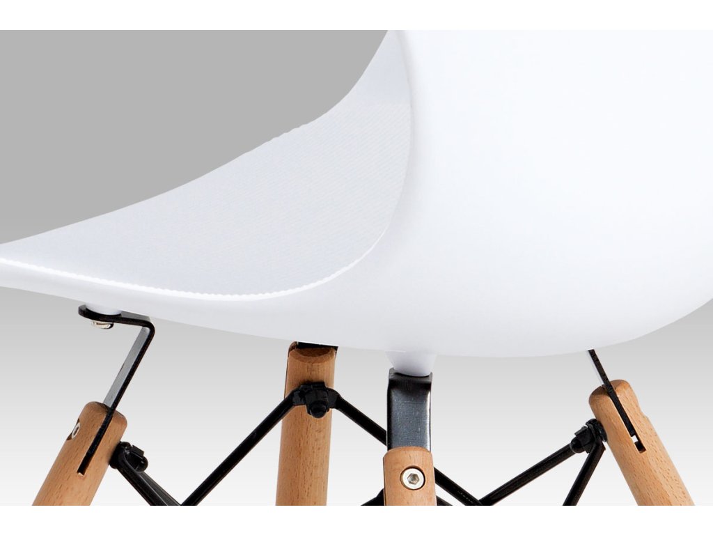 Zajímavě řešená podnož z masivního bukového dřeva v barvě natural s černými kovovými výztuhami, bílý sedák je z plastu ABS.