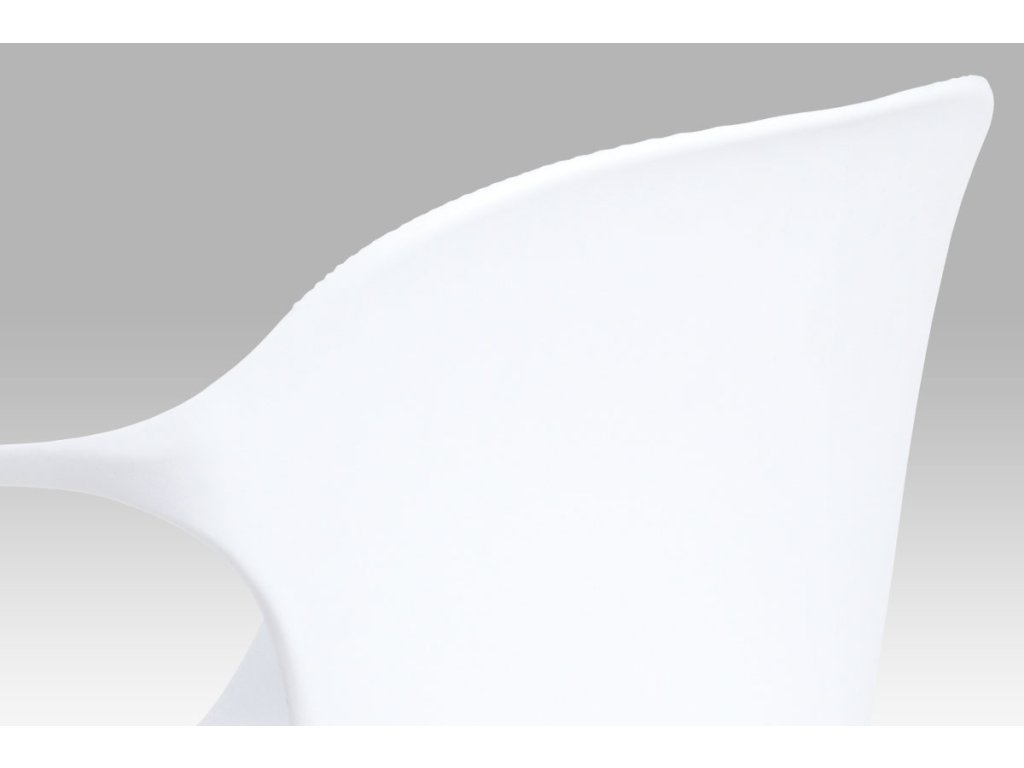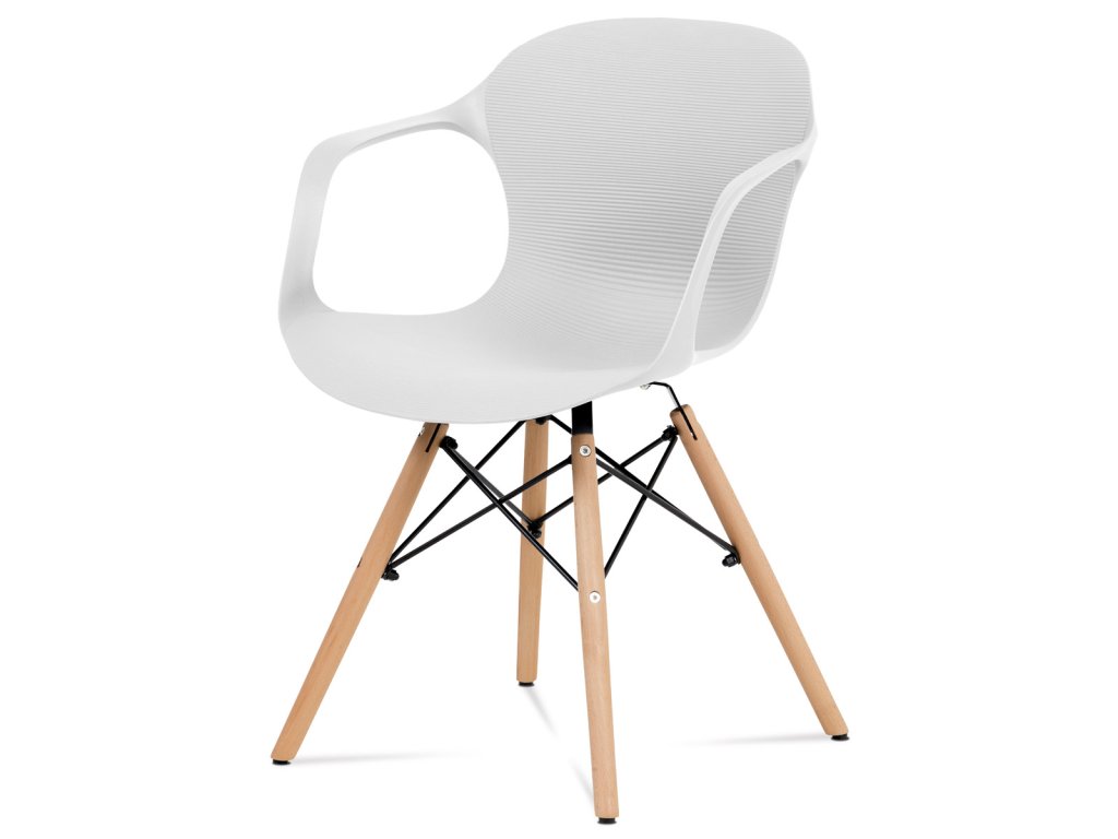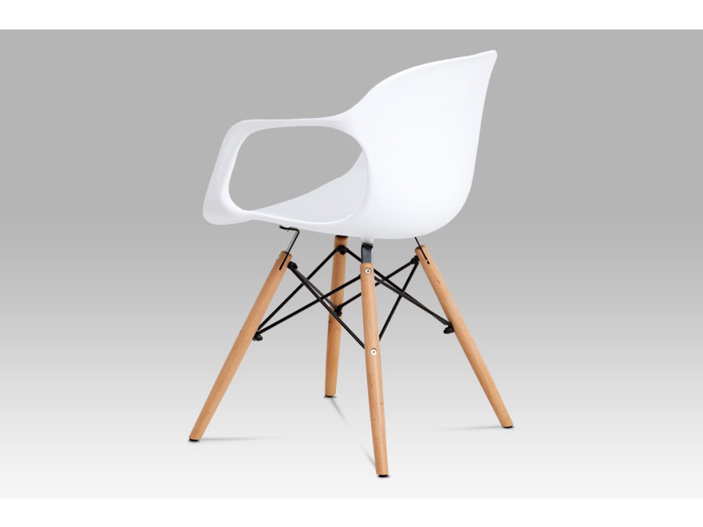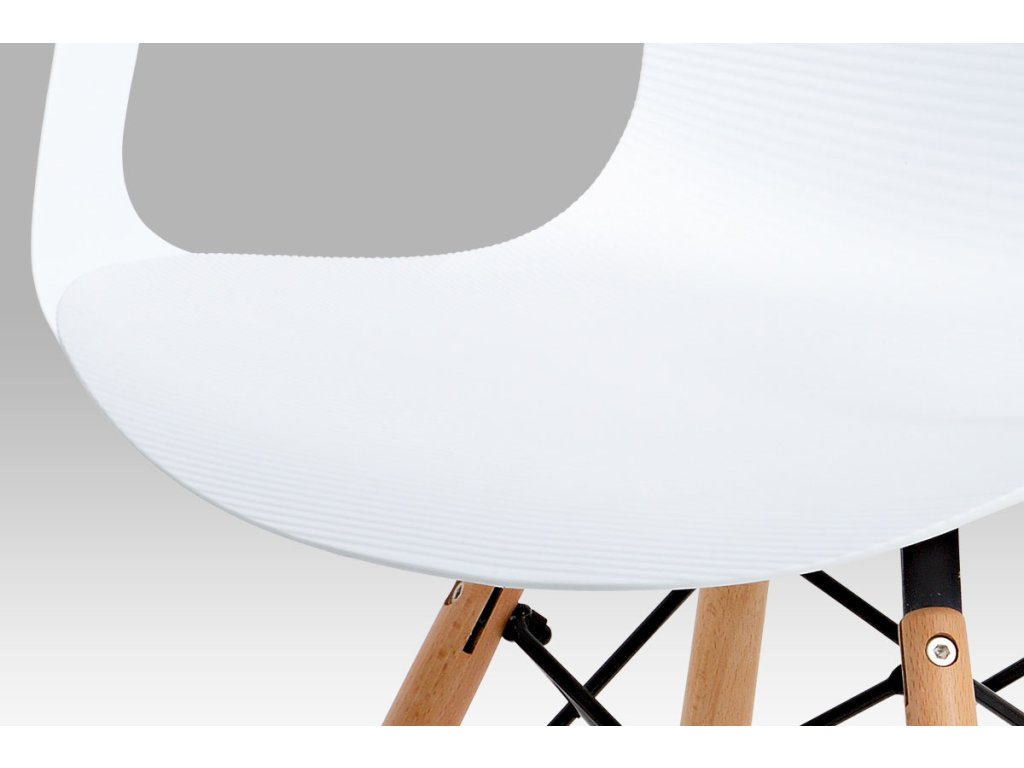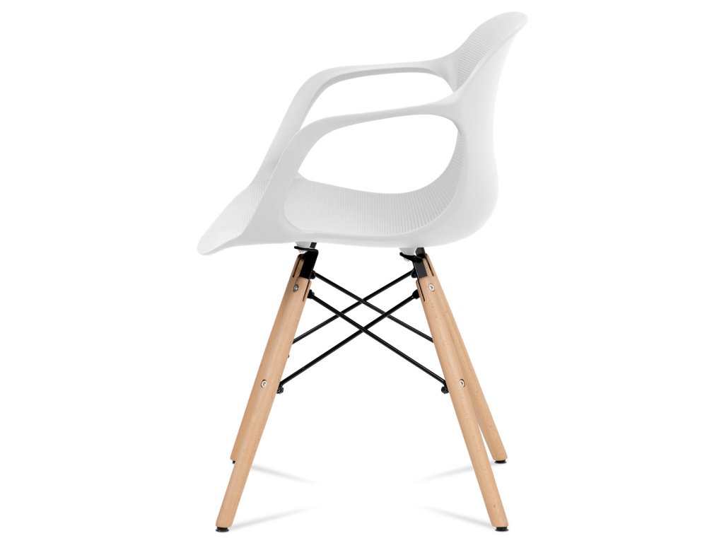 Zajímavě řešená podnož z masivního bukového dřeva v barvě natural s černými kovovými výztuhami, bílý sedák je z plastu ABS.