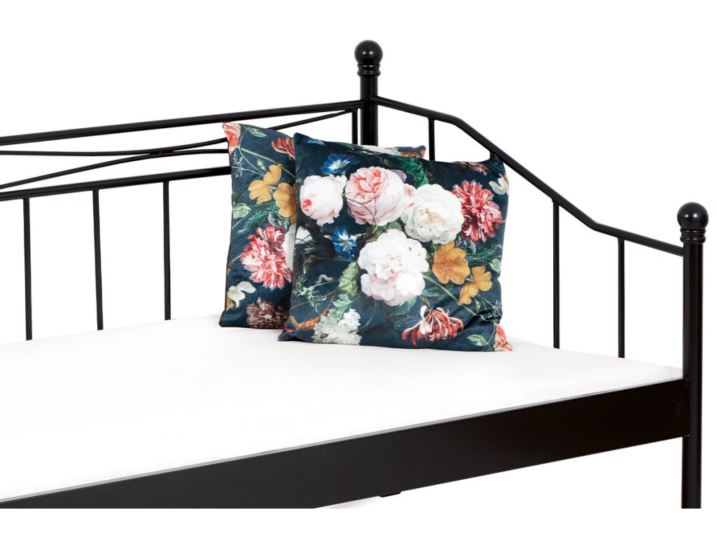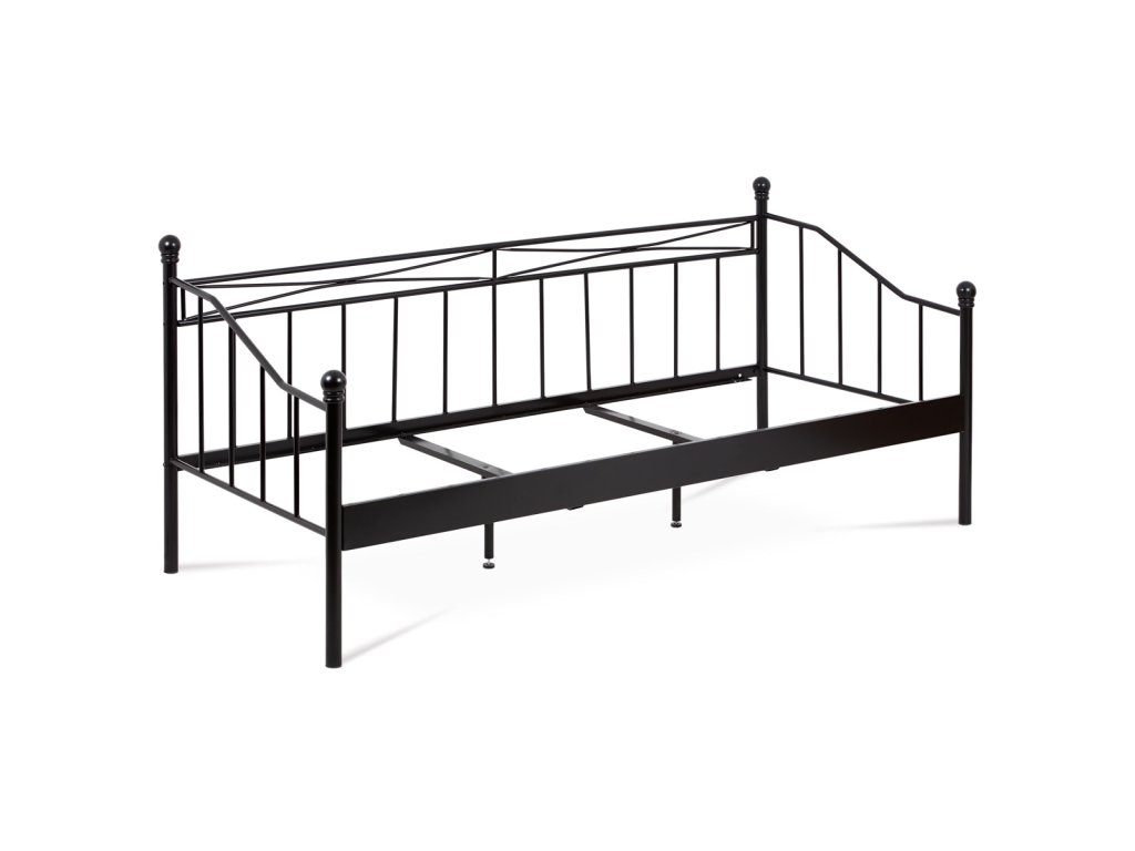 Jednolůžková kovová postel matné černé barvy.