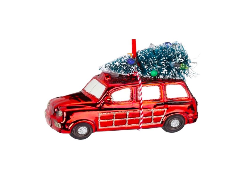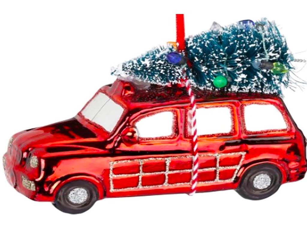 Skleněná vánoční ozdoba ve tvaru červeného autíčka vezoucí stromeček.