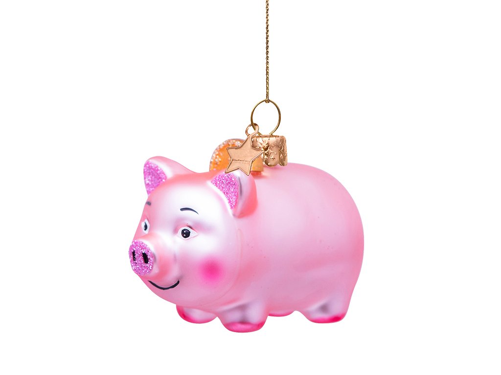 Skleněná ozdoba ruční výroby s motivem růžového prasátka.