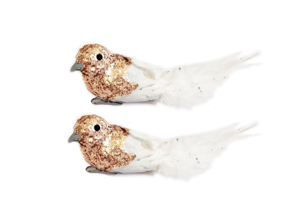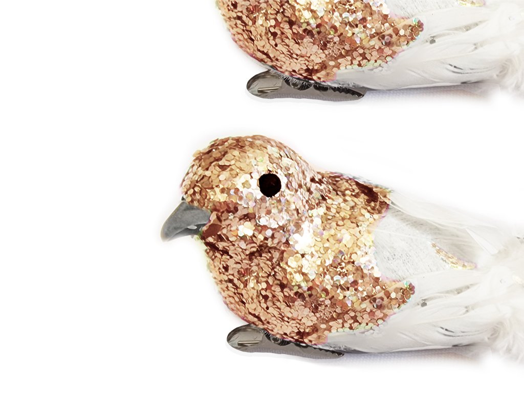 Sada 2 kusů ozdob v podobě ptáčků s bílým peřím a glitery v barvě champagne.