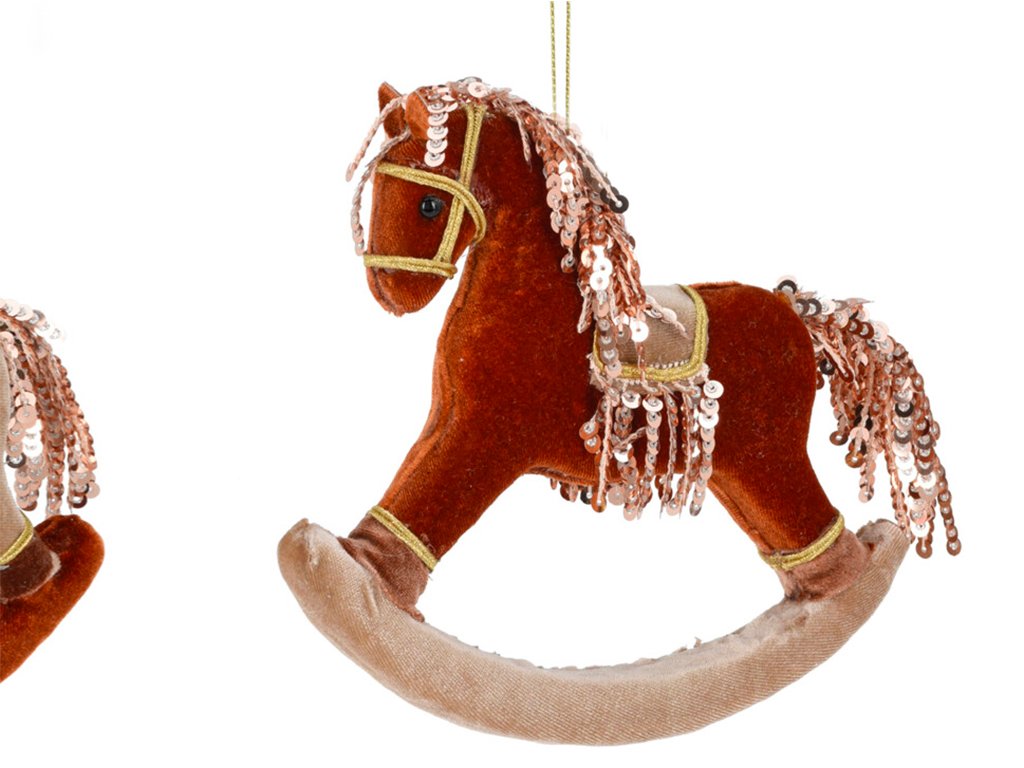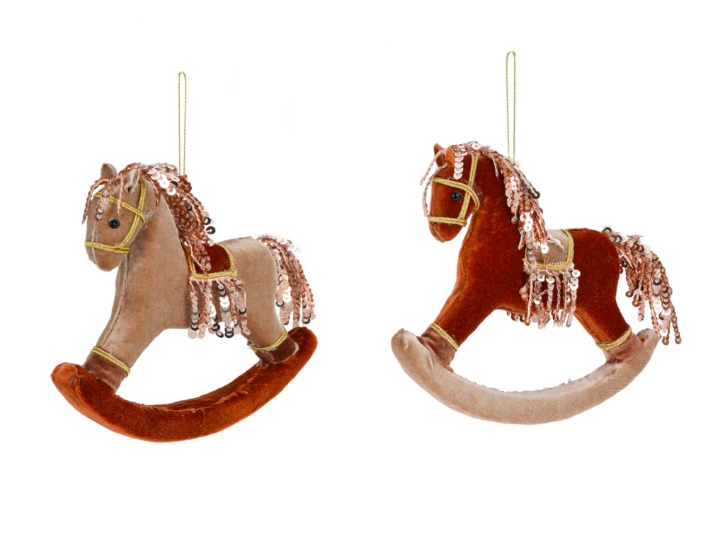 Sada obsahuje 2 ks dekorací ve tvaru houpacího koně v odstínech hnědé, každý o velikosti 17 cm.