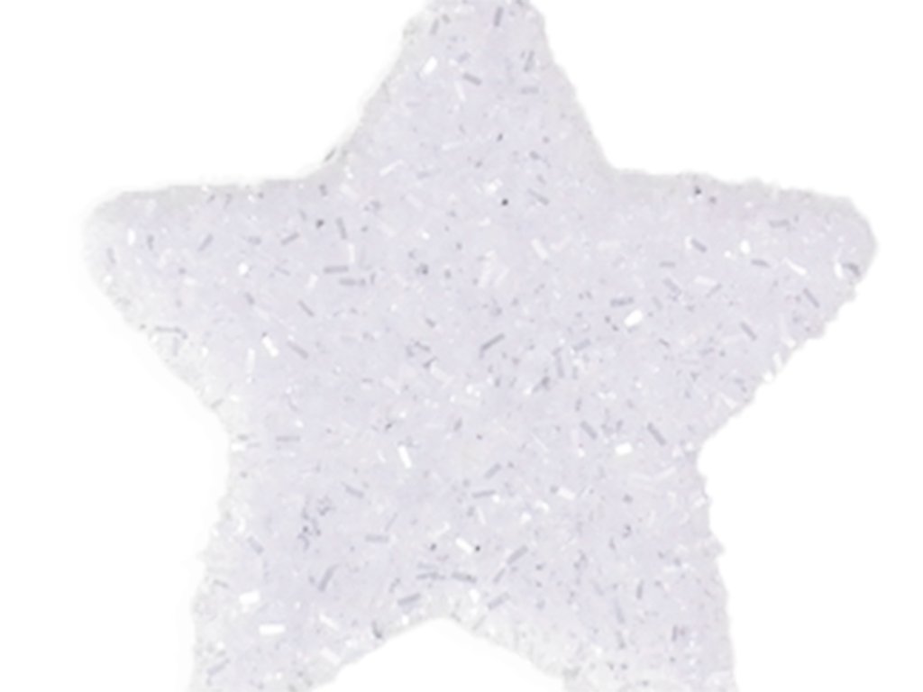 Bílé hvězdy o průměru 10 cm jsou vyrobeny z polystyrenu a zdobené glitery.
