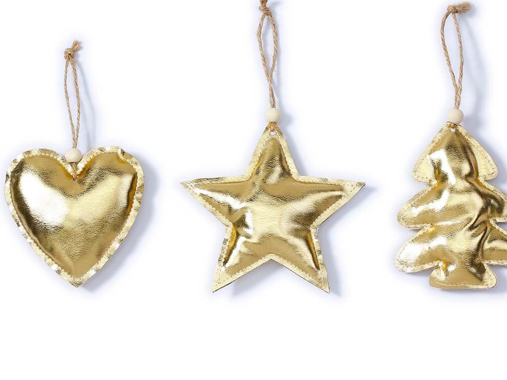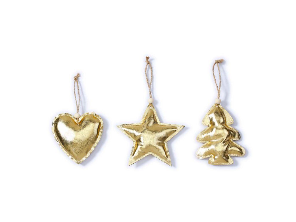 Sada 3 ks textilních ozdob ve zlaté barvě s motivem srdíčka, hvězdy a stromečku.