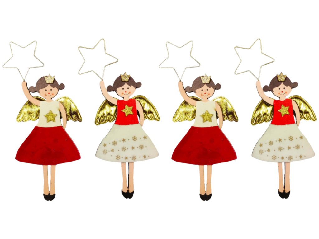 Sada 4 ks dřevěných dekorací v podobě andělů se zlatými křídly.