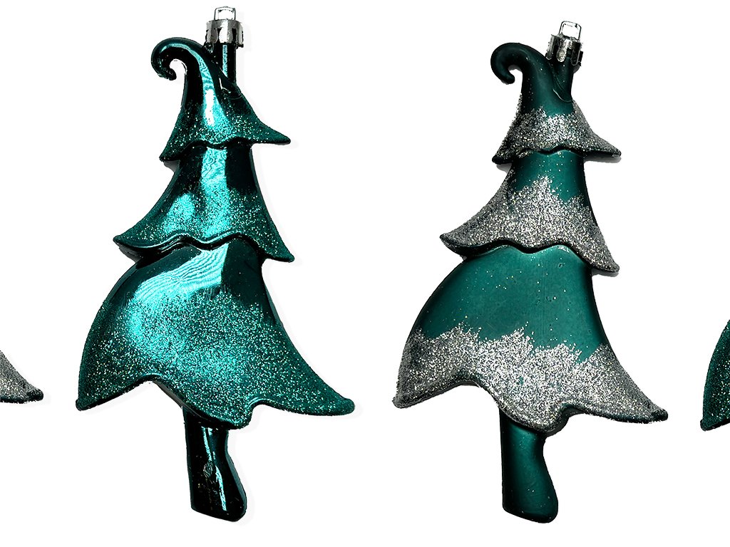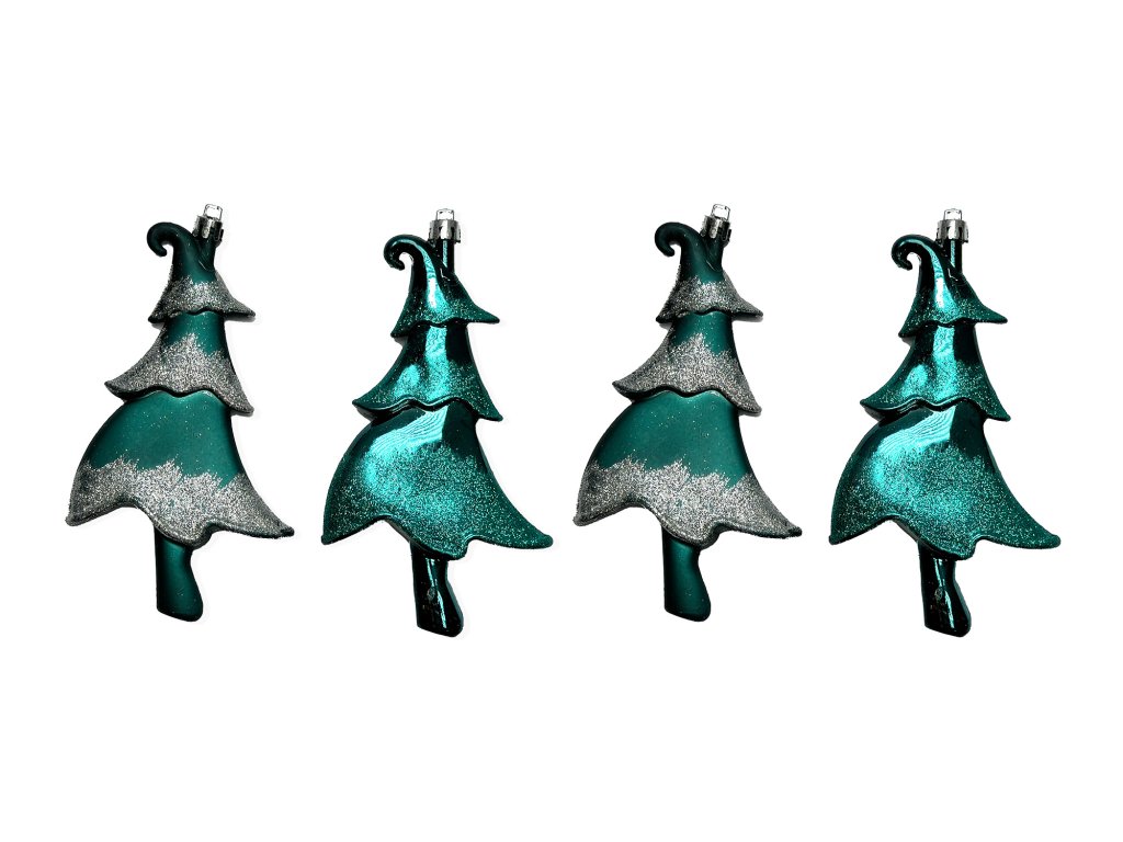 Sada 4 ks ozdob v podobě elegantních zasněžených stromků v petrolejové barvě, vyrobených z recyklovaného plastu.