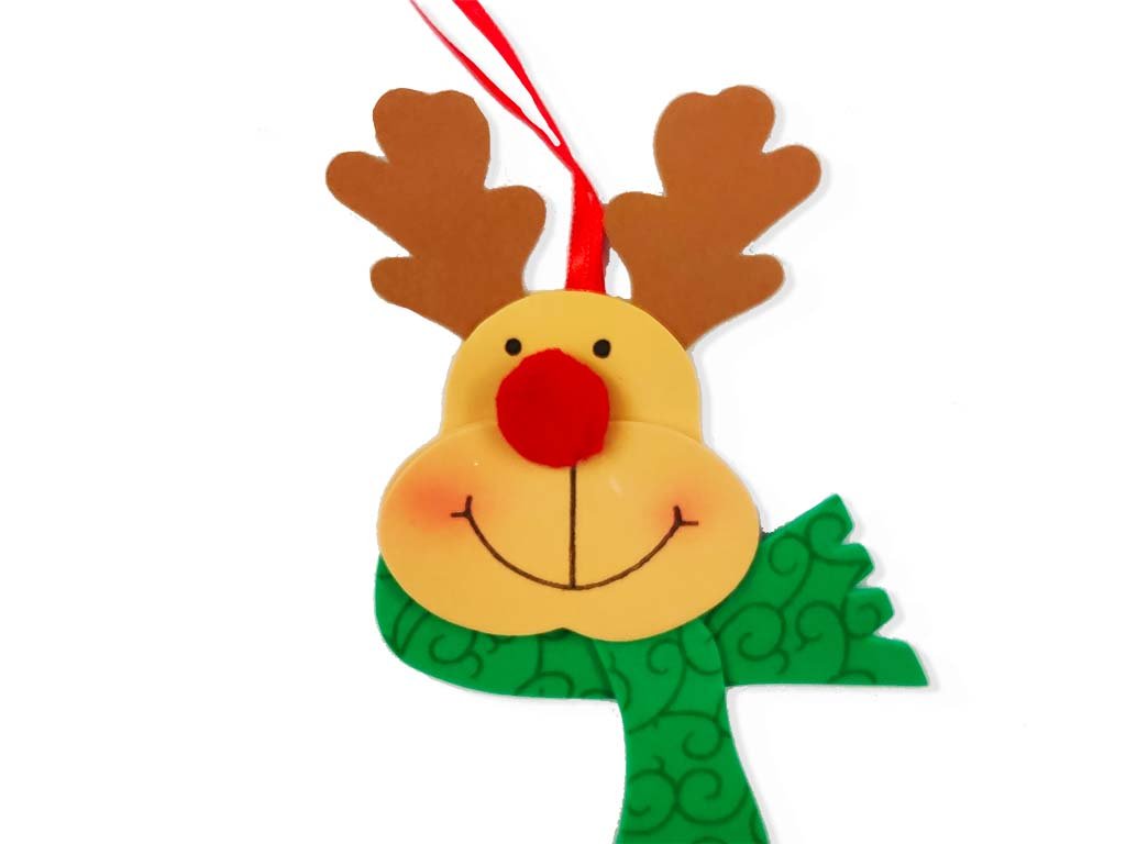 Textilní ozdoby na stromeček v podobě sobů s červeným nosem a šálou.