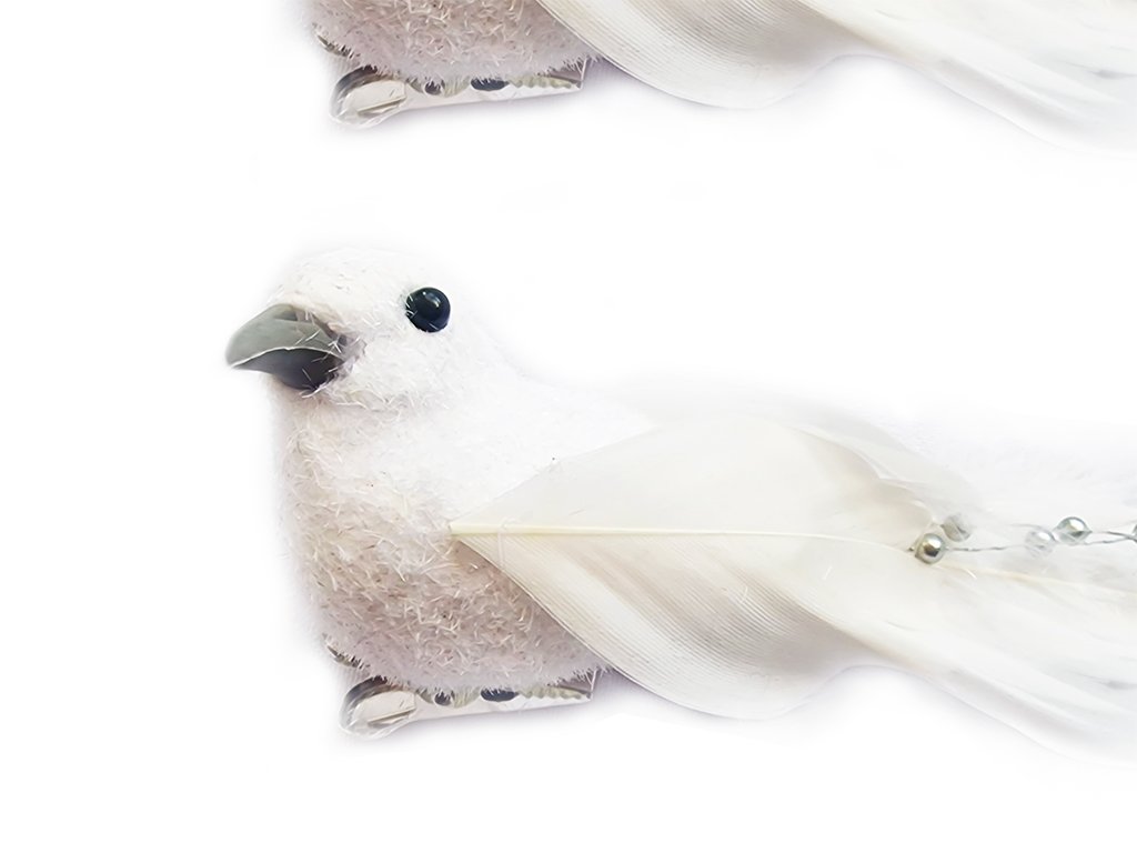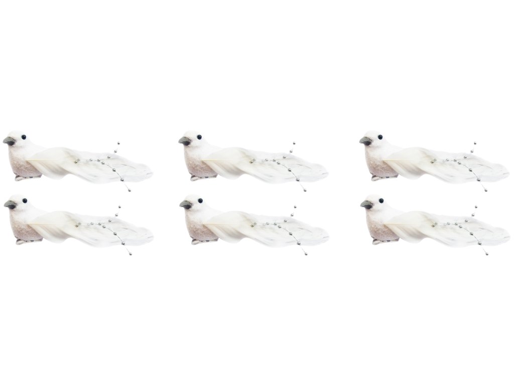 Sada 6 ks dekorací: Ptáček na klipu bílý s perlovým ocáskem 14 cm